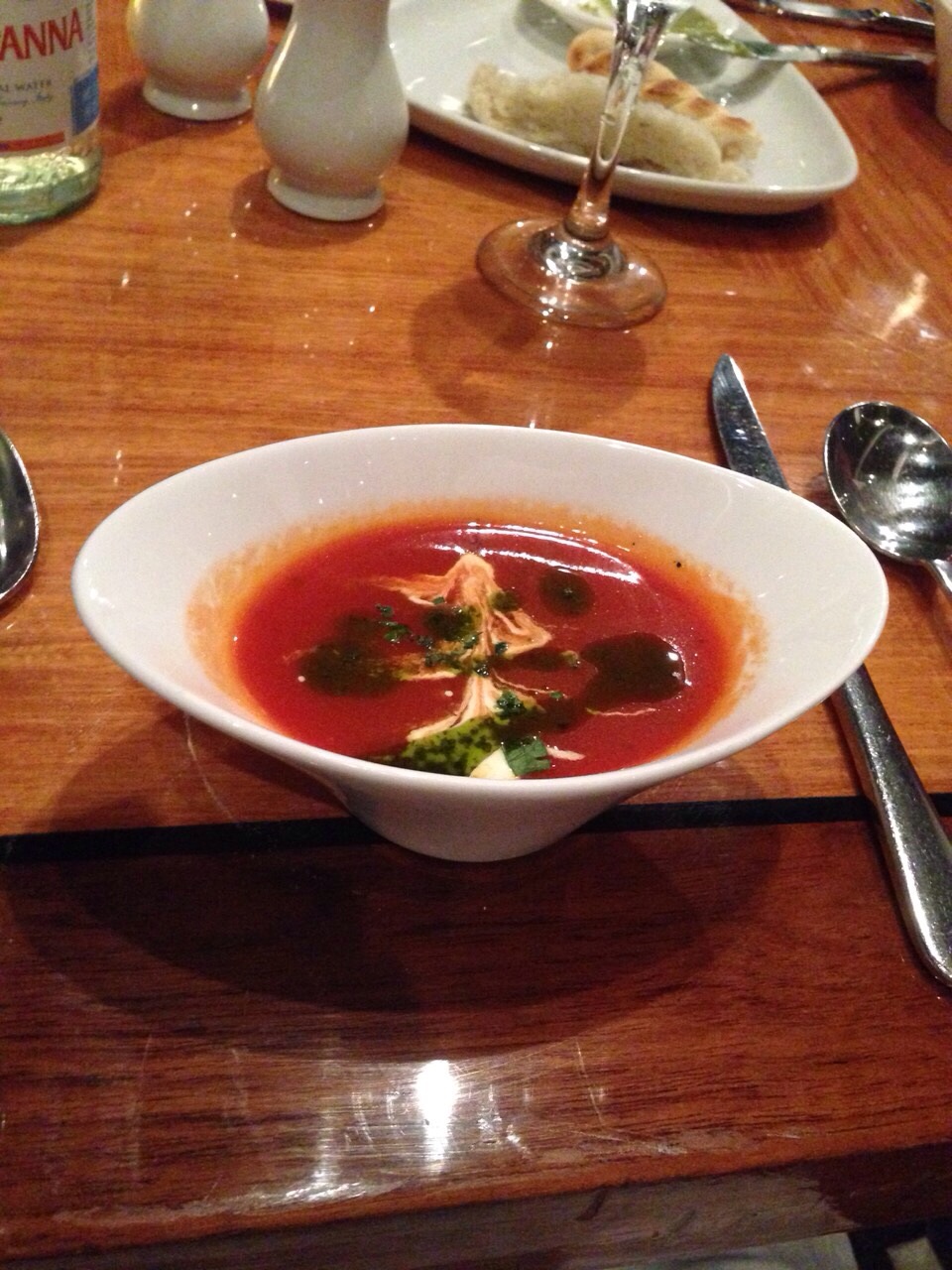 パン、スープ、パスタ、メイン(牛ヒレのステーキかサーモン)