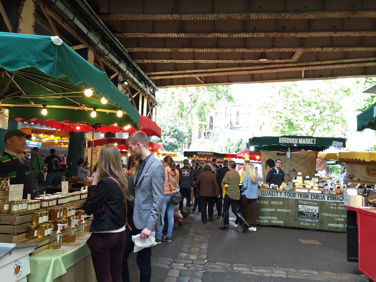 バラマーケットはテムズ川を背にして反対方向に伸びる市場ですが、ベンチがある温室のようなガラス張りの温室みたいな空間がテムズ川方面の道路沿いにあります。そちらで座ってゆっくり食べることが出来ます。ゴミ箱もありみなさんそこで食べてました。マーケットのすぐ隣ですが、少し気づきにくいかも。