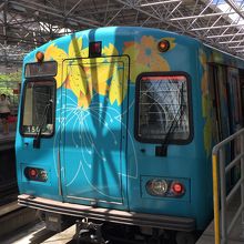 写真の温泉列車が到着し、温泉気分を盛り上げてくれます。