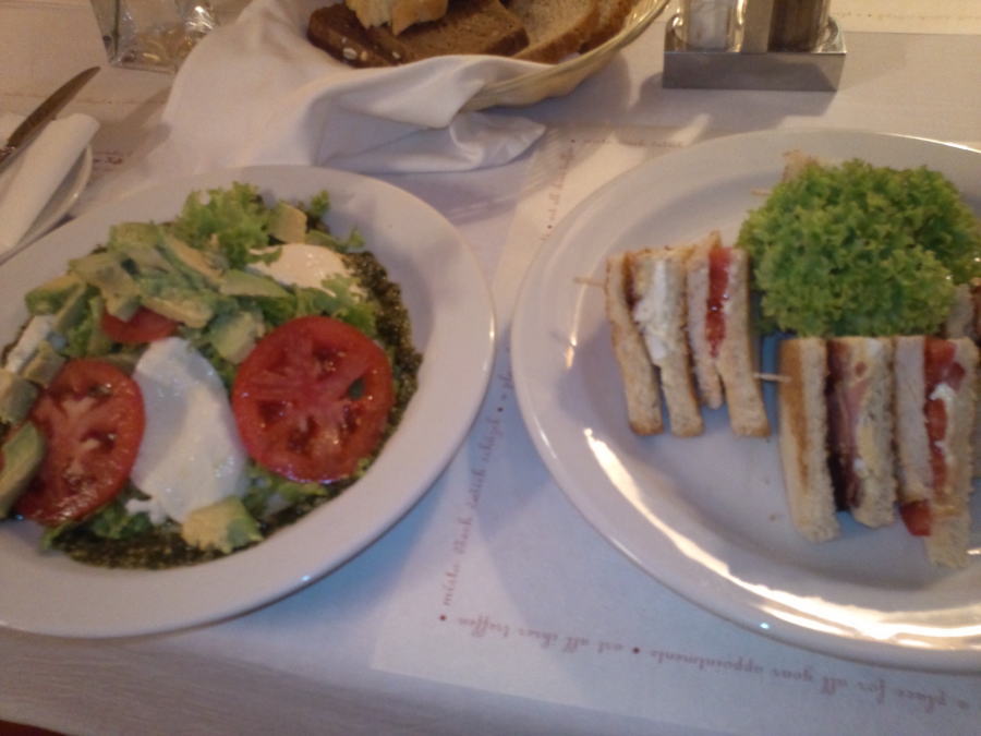 ローストダックのクラブハウスサンドイッチと、モツァレラとアボカドのサラダ、コーヒー、ビールで345K。サンドイッチはすごいボリュームで多すぎて残してしまいました。