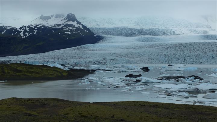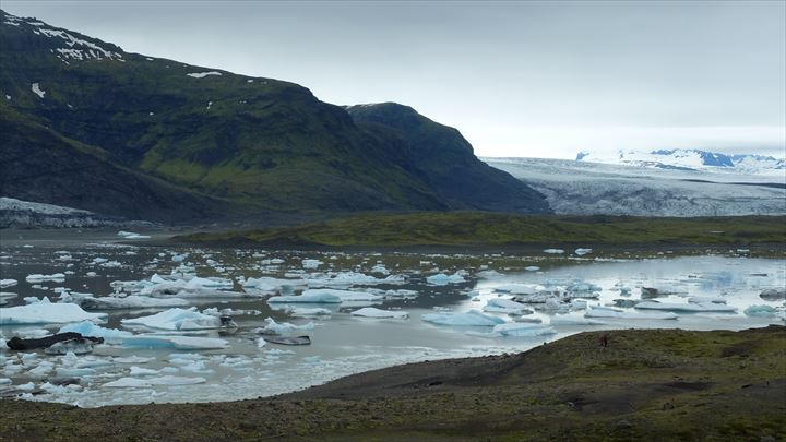 元はモレーンだったらしい土手の上から見るフィヤトルスアゥルロゥン氷河湖は、ヨークルスアゥルロゥン氷河湖程の大きさはありませんが、フィヤトルスヨークトル氷河が視界いっぱいに広がって見えるのが魅力。