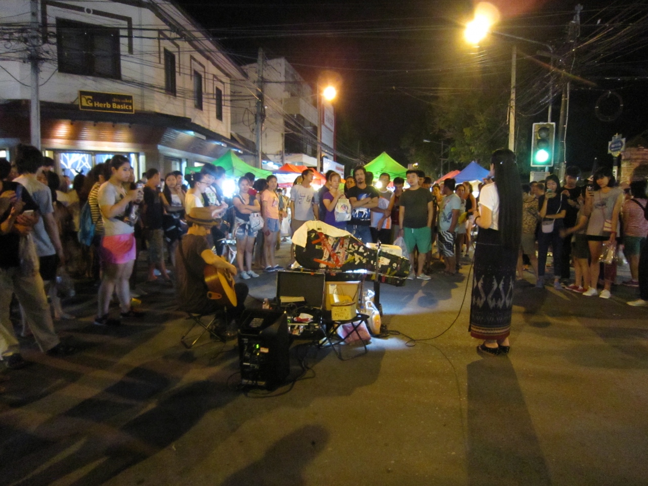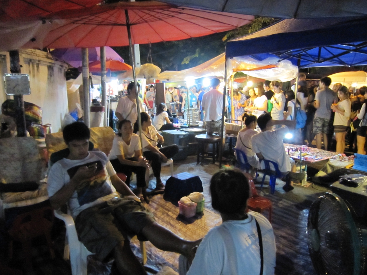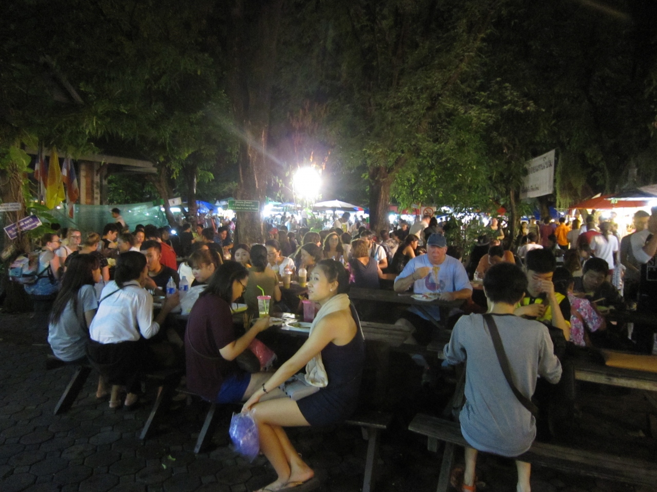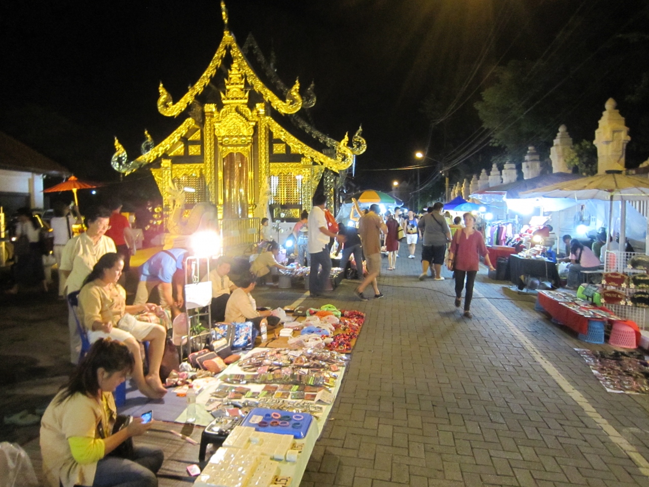 旧市内の中心部、ターペー門からワットプラシンまでとにかく凄い人出です。通りいっぱいに人がいました。ナイトバザールの人出と比較にならないです。こんなにも観光客がいるとは思いませんでした。通りでは露店のほか音楽を鳴らす人々あり、食べ物屋あり、足マッサージありで楽しめます。お寺も開放している所が多くあり、ライトアップしています。綺麗です。夕食としてマンゴライス50Bとドリアンライス60B食べました。美味しかったです。