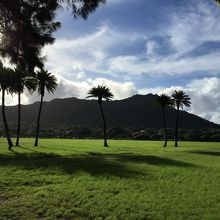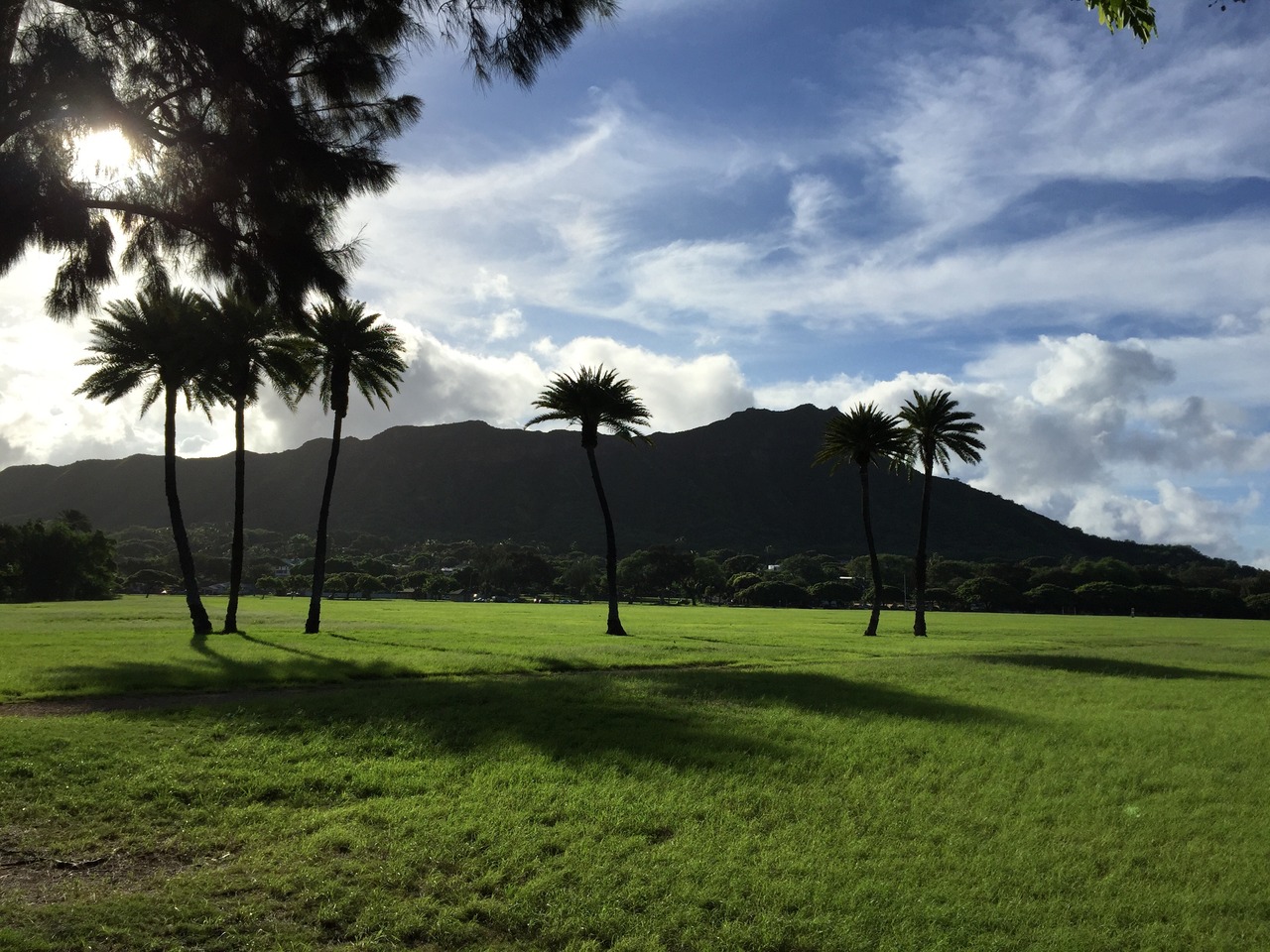 ハワイの朝は、早めに起きてカピオラニ公園まで散歩をします。人も少なく、ここからのダイヤモンドヘッドの眺めはいつもかわらず雄大な景色です。秋はいつも茶色い山肌ですが、今年のハワイは雨が多く、緑のダイヤモンドヘッドが見れました。