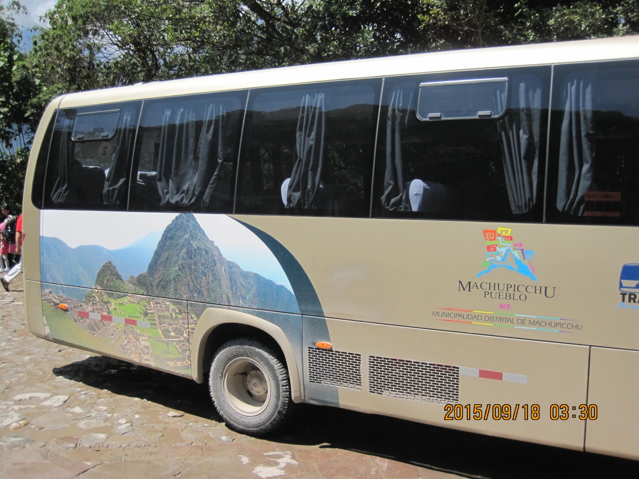 列車を降りてすぐのマチュピチュ村からマチュピチュ遺跡までのバスです。乗って30分くらいでしょうか?しかしくねくね道がずっと続き、細い道ですので対面から来るバスと譲りながらゆっくりとのぼっていきます。私が訪れた日はペルーの修学旅行生が来ていたこともあり、乗り場はかなり混雑していました。帰りのバスも30分程待つことになった為、帰りの列車の時間には余裕をもって帰路に着くことをおすすめします。