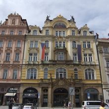 一番目立つのは、二本の尖塔を持つティーン教会です。 その並びにあり、屋根に人形のある建物です。