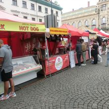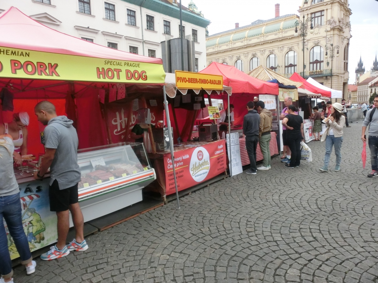 新鮮な野菜や果物、もうもうと煙を上げて鹿、イノシシなどの四つ足の串焼き、チェコの銘菓??大竹輪のような揚げパン売り……と、見るだけでも楽しい。