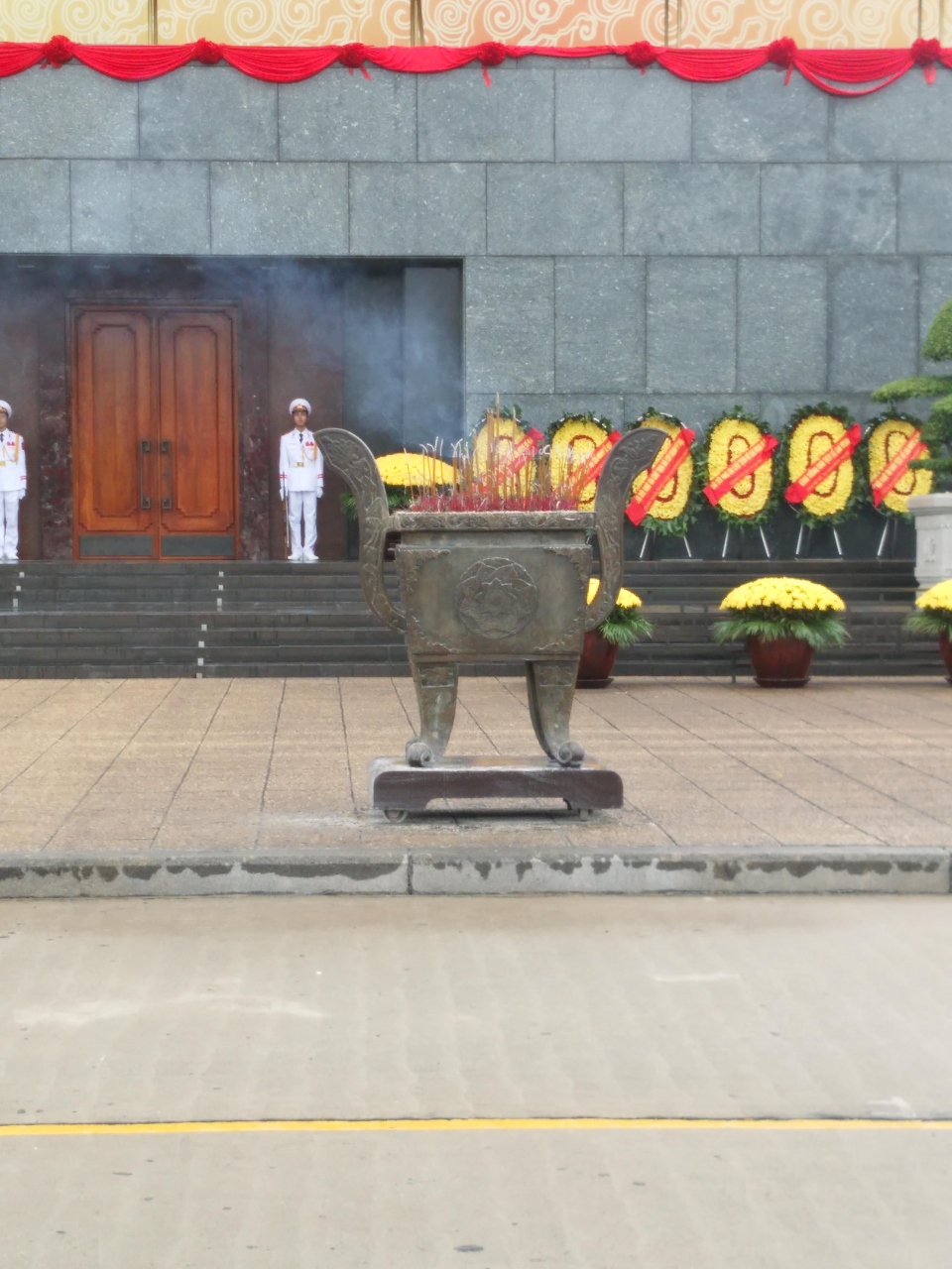 9月3日。午前中は保存されているご遺体を見せていただくことが可能だそうです(長蛇の列とのことですが・・・)。ツアーは午前にハロン湾を出発したので、ハノイに到着したのは午後でしたので、残念ながらそのお姿を見ることはできませんでしたが、ガイドさんのご尽力でお線香をあげることができました。通常は写真の黄色いラインより中に入ることもできません。