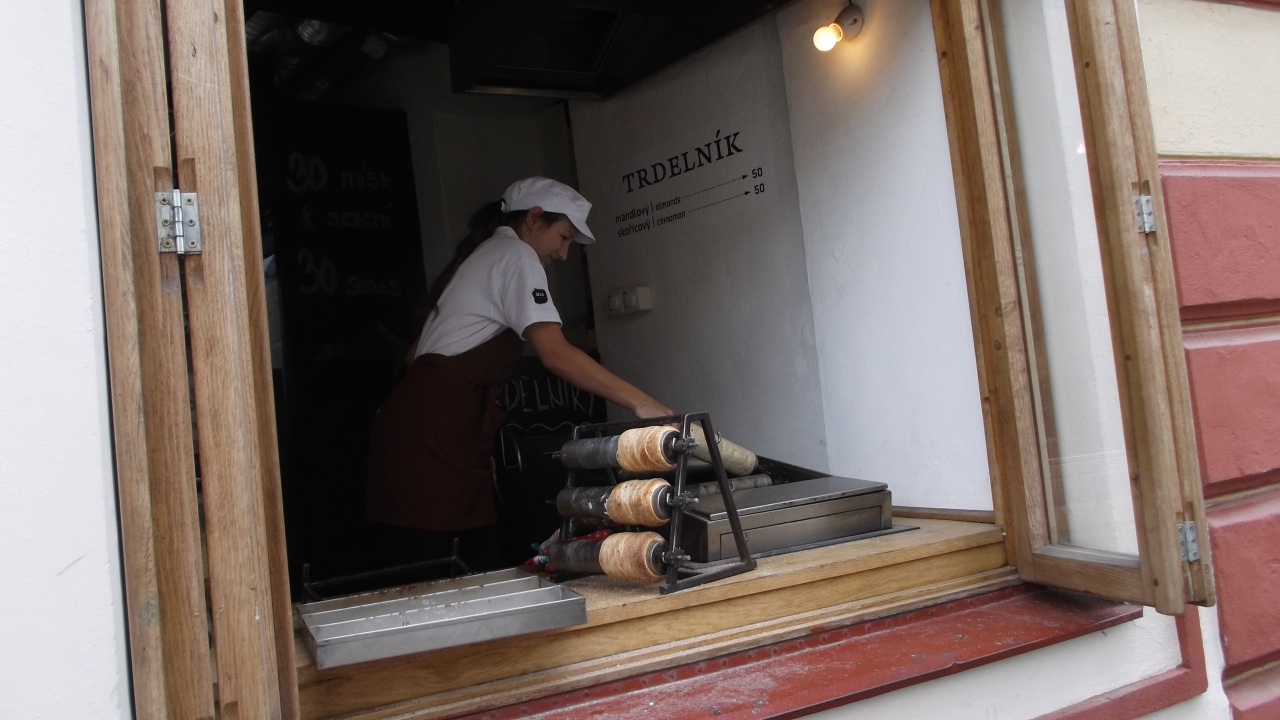 ここにベンチがあったので、名物の「トルデルニーク」という、くるくる回しながら焼くお菓子、粉砂糖をまぶしてたべる物を買い、食べました。