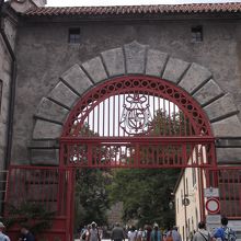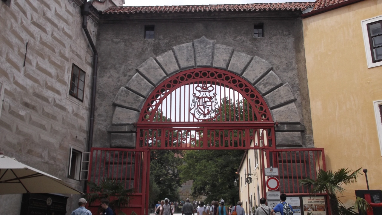 チェスキークルムロフ城の入り口にあたる門です。 門の上には、紋章があります。