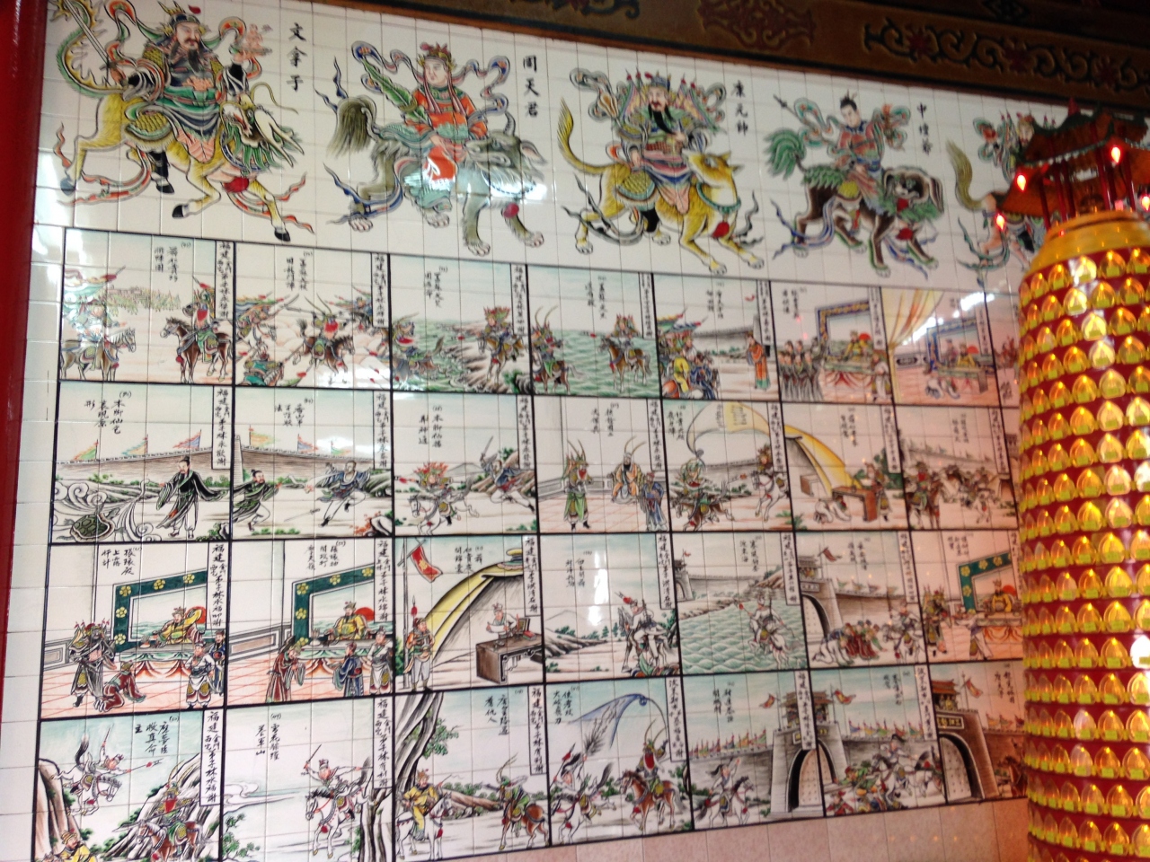 タイル画があります中国語はわからなくて読めませんが絵には順番がふってあり、その順で見て行くと何となくわかります。孫の手で背中を各老人のタイルがあり面白かったです。イルミネーションもあるので夜きれいそうです。ドラゴンの目にランプがはめ込まれていました。