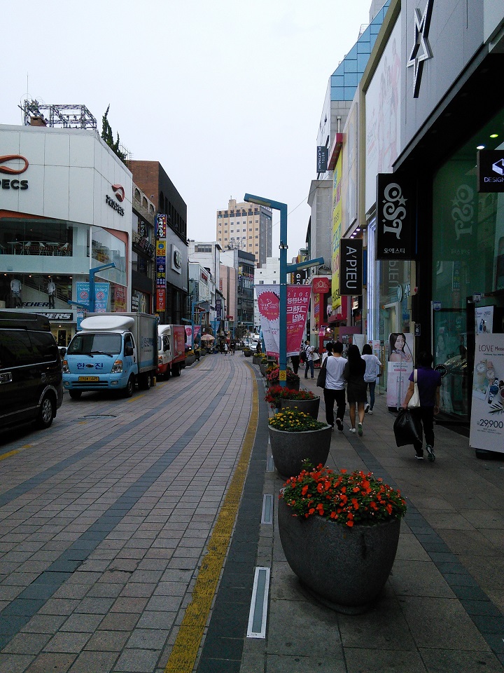 南浦洞のコスメショップが並ぶにぎやかなファッションストリートでございます。