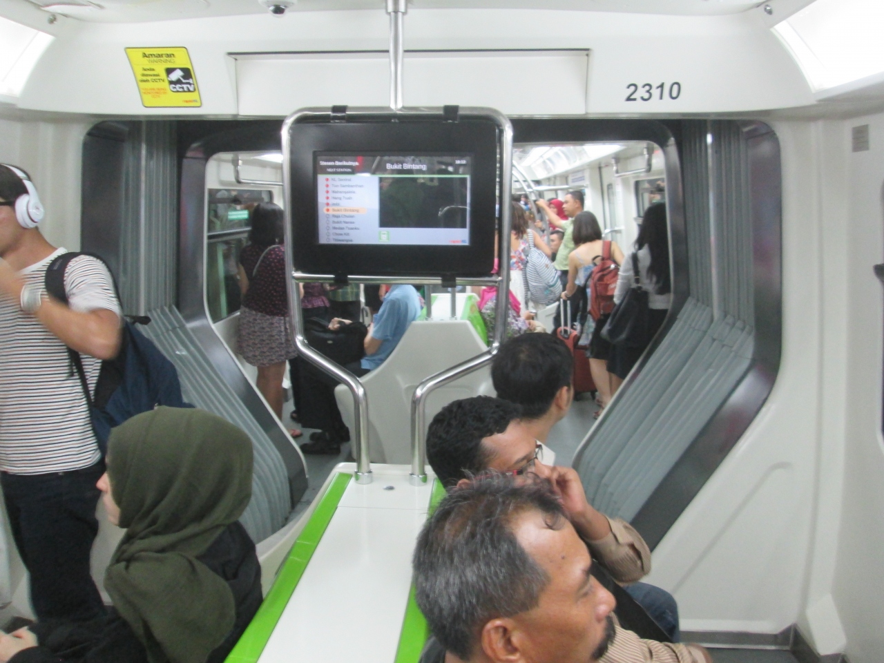 2両編成の短い車両です。車内は座席数が少なく狭いので市内中心部になると写真のように混雑します。市内の道路は渋滞しており移動時間が読めないので、運賃が安く移動時間が読めるので、利用客が多い交通手段になっています。