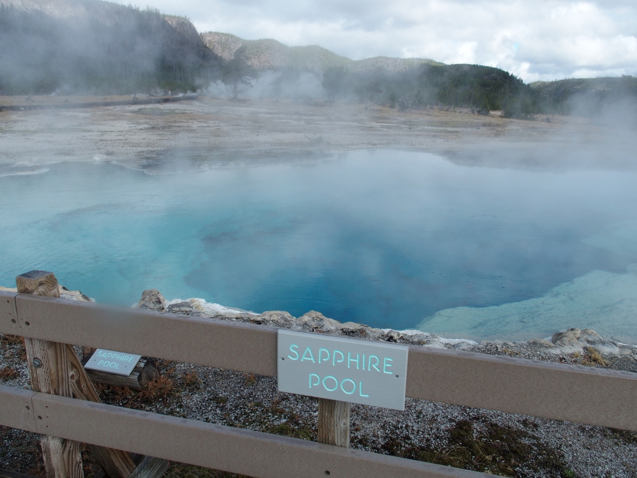 真っ青に透き通ったサファイアベイスンは、ビスケットベイスンの最大の見どころのひとつ。ロワーベイスンからも近いので、一見の価値ありです。オールドフェイスフルとは一味違った鮮やかな美しさと湖面の透明度の高さに感激しました。