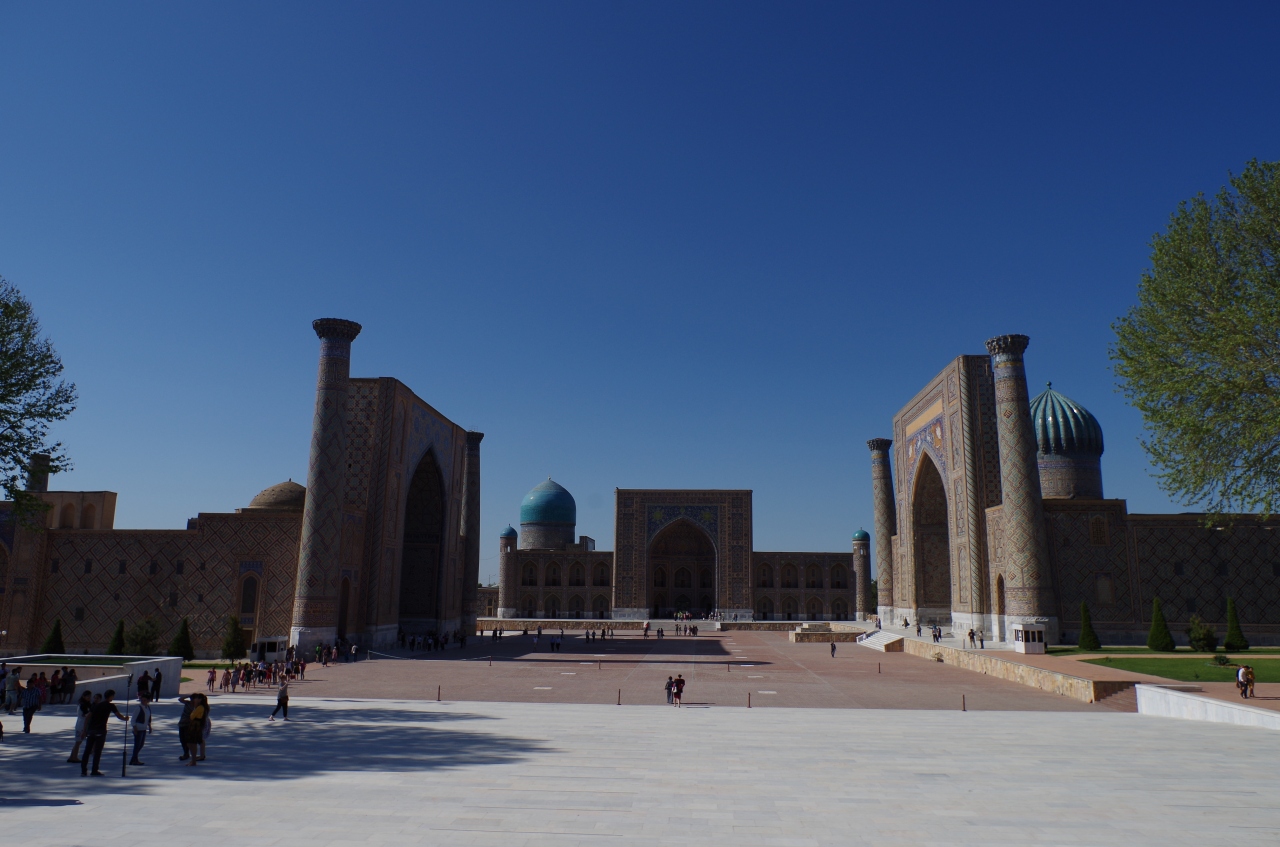サマルカンド観光の中心、レギスタン広場。写真では、何度も見てはいましたが、実際来てみると、その大きさに圧倒され、また、内部の装飾の緻密さに驚かされます。広場に腰掛け、雰囲気に浸っていると、国内の観光客の方が周りにたくさん来て、女性グループと一緒に写真を撮ったのを皮切りに、なぜか、子供からおばあちゃんまでたくさんの人と、写真を撮りました。日本人が珍しかったようです。
