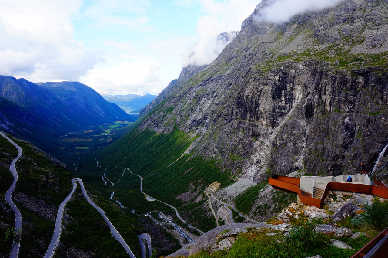 オンダルスネスからガイランゲルにバスで行くとき通る道です。こんなすごいカーブをよく曲がれるもんだなと思うような道を難なく運転していく。最初はとても怖かったが慣れてくると、周りの素晴らしい景色に目を奪われる。トロルスティーゲンとはトロルのはしご段という意味のつづら折りの急な坂道が続いています。展望台もあり、バスも30分ぐらい休憩をもらえるので、絶景を楽しめます。