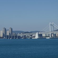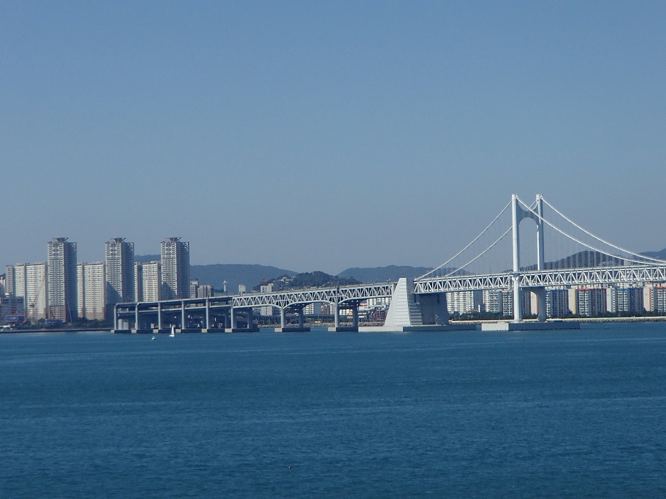 釜山の広安里ビーチの海をまたいでかかる長大な橋でございます。海岸から上がって海に入ったところでカーブしてまっすぐにのびる姿はたいへん雄大でございました。