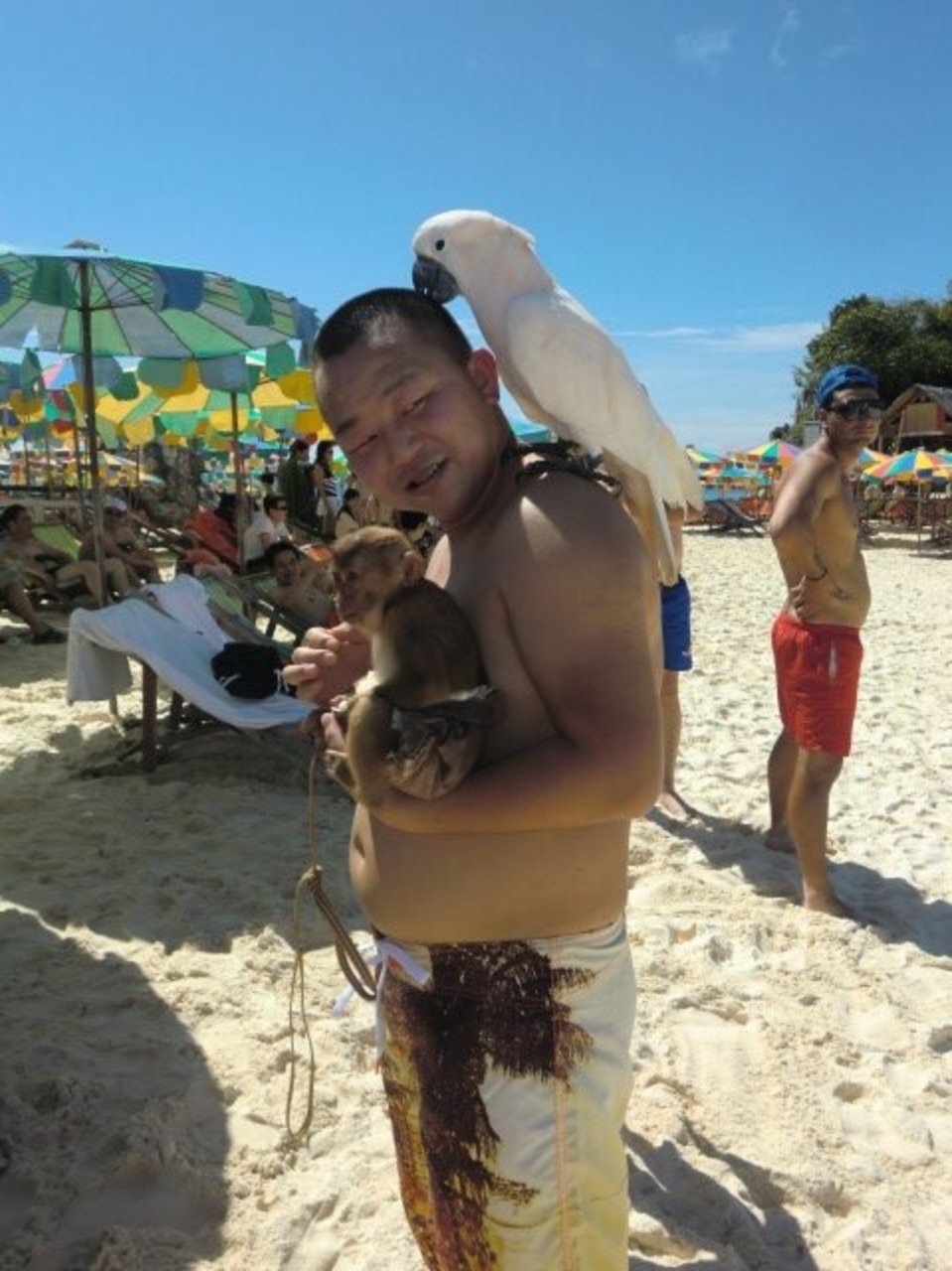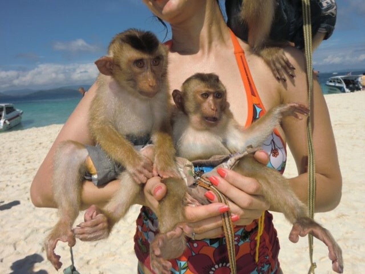 やはり小さい女の子などは水着のパンツをひっぱられたり、お父さんが抱きかかえて威嚇しても威嚇し返して向かってきてました!木の上からは人間が残して行ったジュースの空き缶を人の頭の上に落とすなど凄い賢く驚きました!人間に育てられたモンキーはとっても可愛く抱っこできたりします!