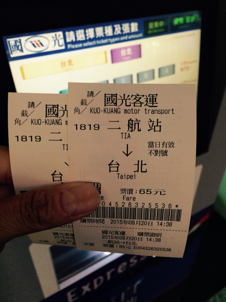 空港内にバスのチケット売り場、券売機があります。券売機で台北行きを2枚購入。1人65元です。