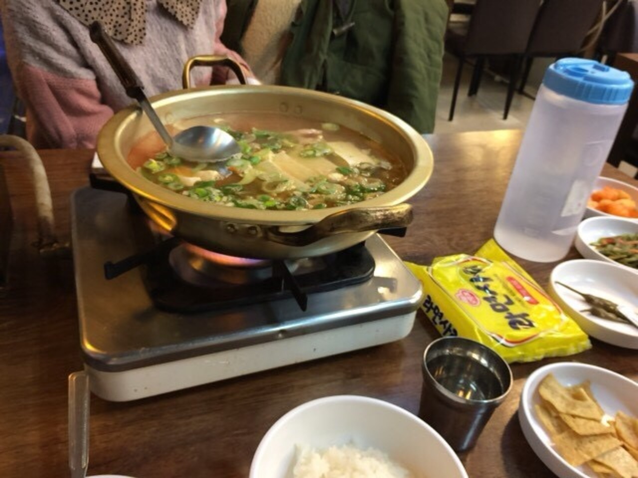 すぐにキムチチゲとごはんと付け合わせが運ばれます。