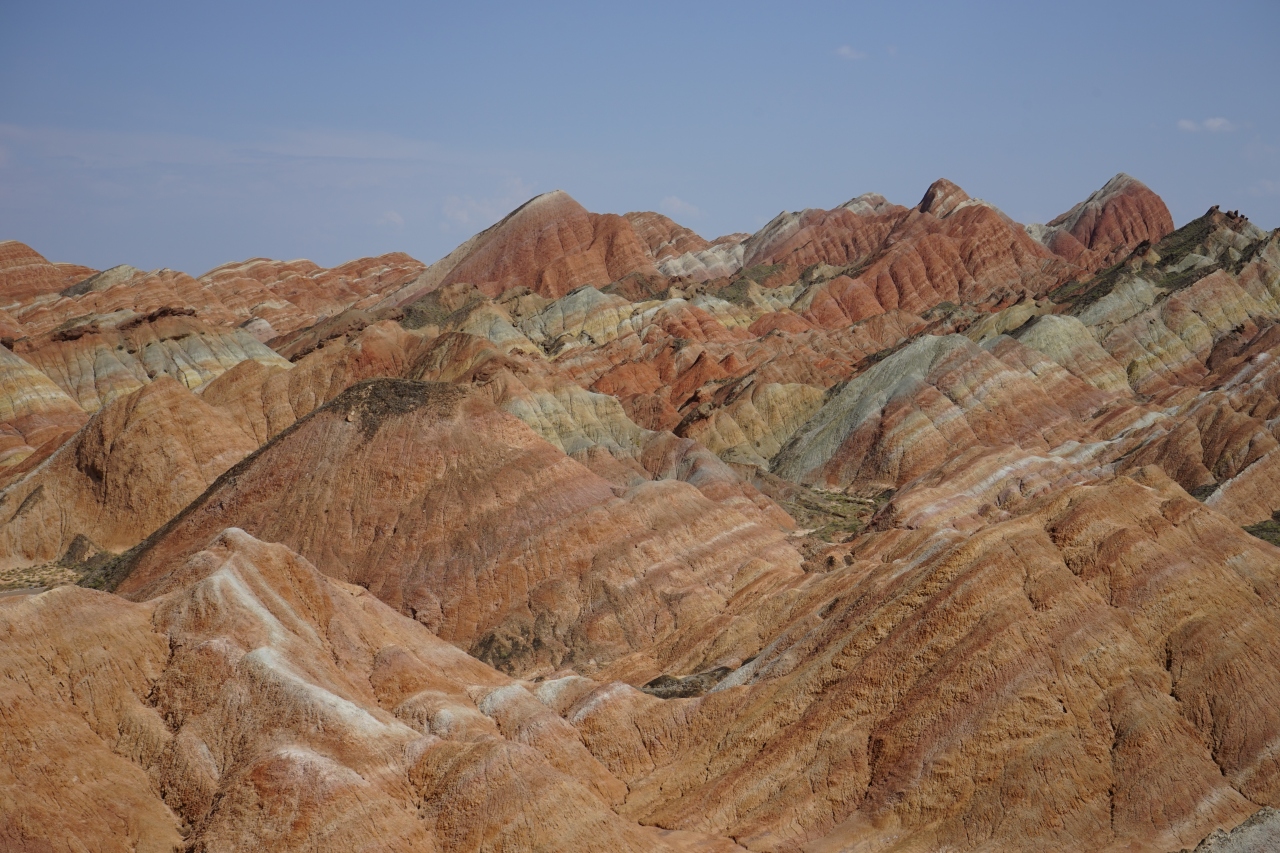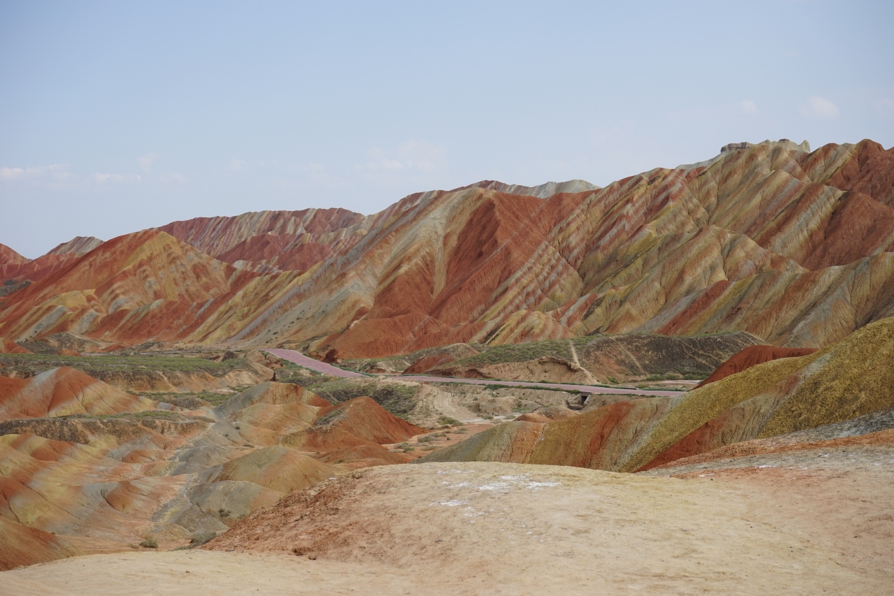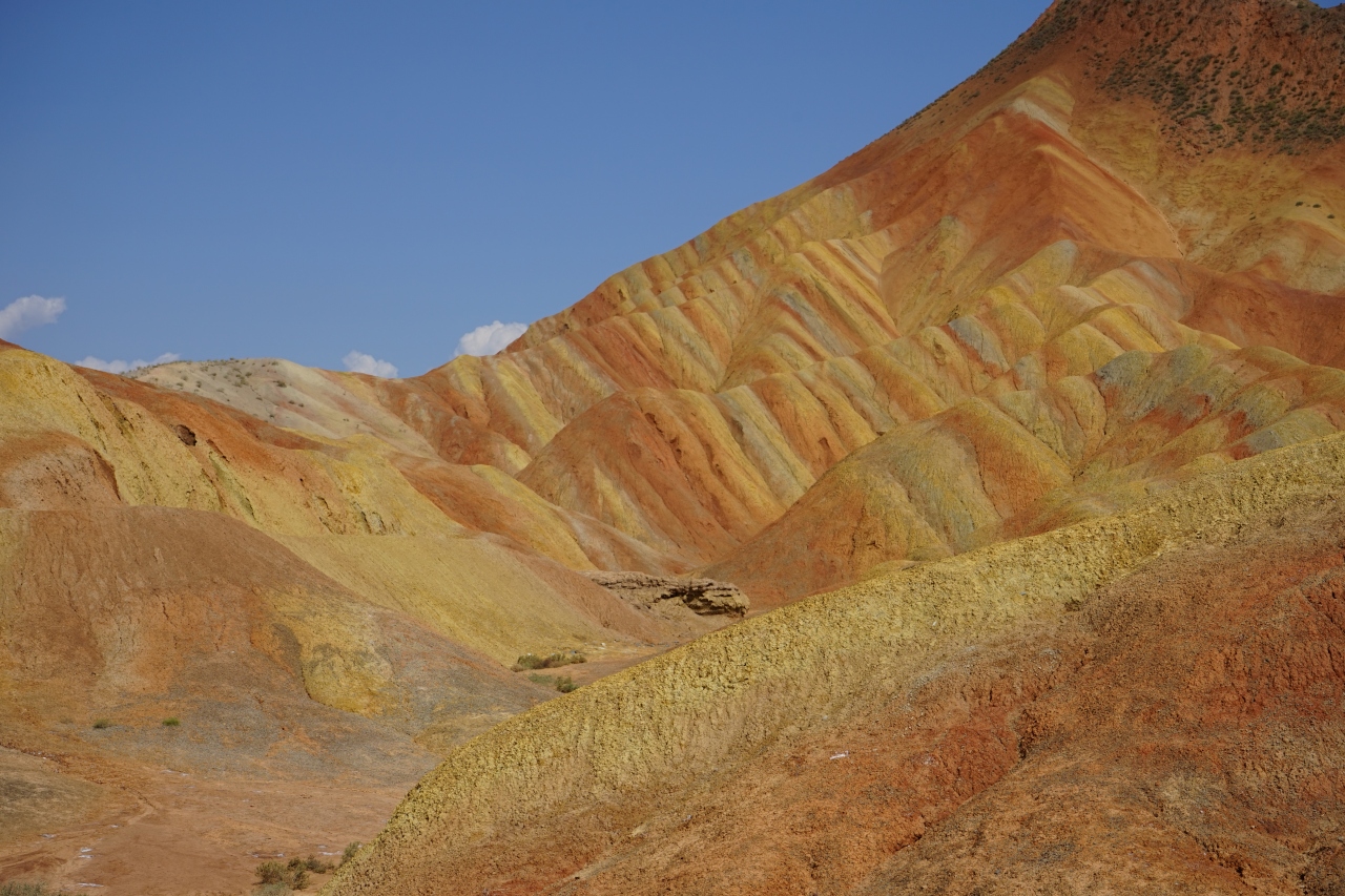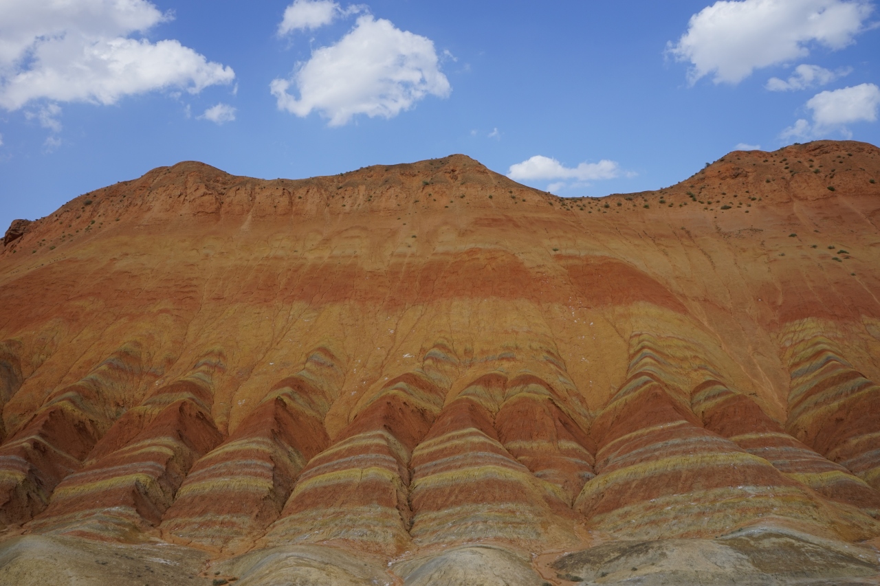この地域の地質には様々な鉱物(硫黄、鉄、銅など)が大量に含まれており、その大地がシルクロード独特の強い日差しを浴びると、すばらしい地層の縞を描き出すのだそうです。