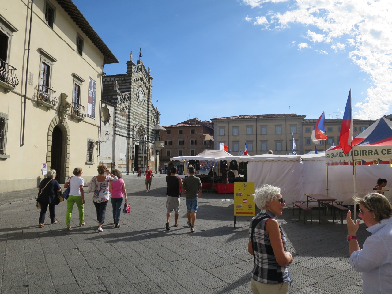 プラートには2つの駅がありますが、小さい方のPrato Porta al Serraglioからの方がドゥオモには近いです。駅前から真っ直ぐの道を歩いていくと、プラートのシンボルであるドゥオモ前に広がる広場です。訪れた時は丁度、市が立っていて洋服や生活雑貨、食料品など様々なものがあり、人々で賑わっていました。