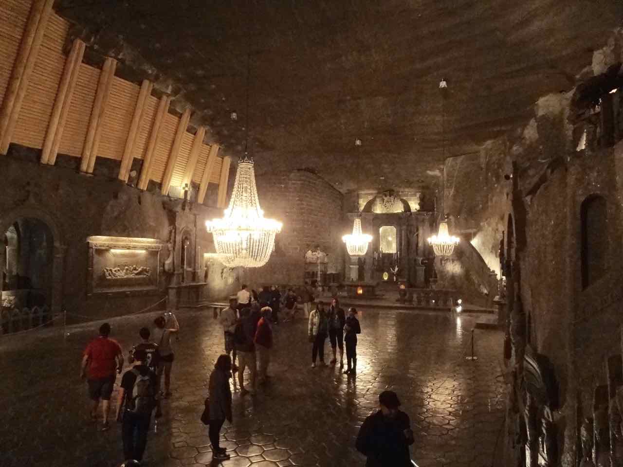 階段で一気に63mまで下りてそこから見学開始です。全長で300km以上ある坑道の内2.5kmが見学コースになっているそうで最深部の130mまで教会や礼拝堂、大広間やフードコート等々、およそ地下とは思えない見所が20カ所以上あります。坑内はどこも写真OKですが、聖キンガ礼拝堂だけは有料でその場で10ztを払う必要があります。(写真を撮らない人は不要)