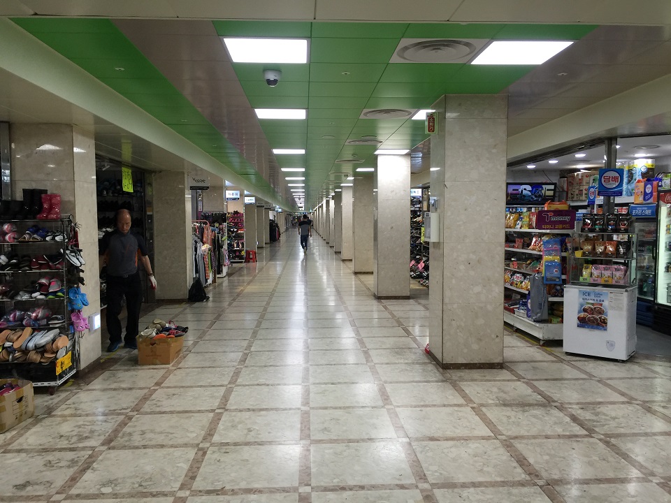 釜山駅周辺の地下街でございますが、釜山にはこのような地下通路がどの地下鉄駅にもございましてどちらにも小さな商店が並んでおりました。お客さんはほとんどおりませんのも共通しておりました。