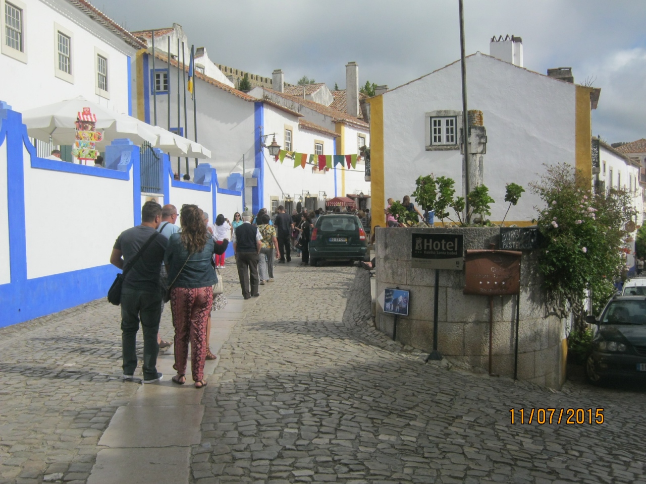 西のポルタ・ダ・ヴィラの門から東のサンティアゴ教会(今は本屋になっています)まで約800m程度の道です。この道の両側はお土産屋が並んでいます。狭い道ですので人々の肩が触れるような感じです。途中にサンタ・マリア広場と教会があります。