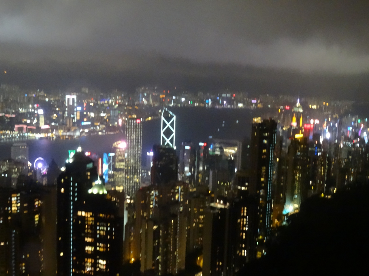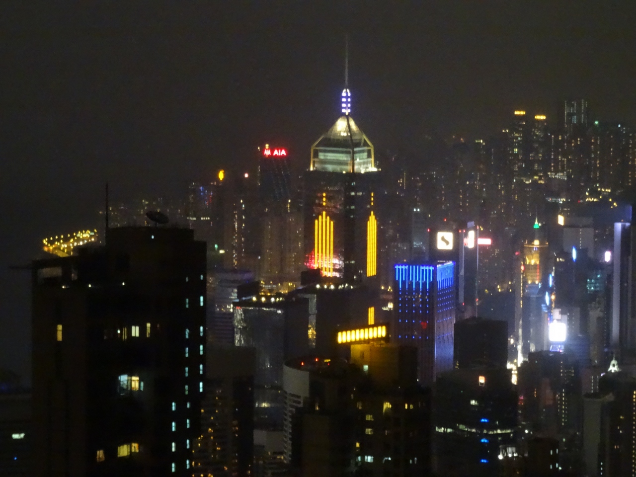 ピークタワーから小道を少し歩くとある、中華風の無料の展望台。国慶節の連休と重なり、ピークトラムは長蛇の列、ピークタワー内も人でごった返していたが、こちらは強い雨と風だったからかほとんど人がおらず、二層になっている下の層で雨を凌ぎながら、夜景を独占してしまった。タイミングよくシンフォニーオブライツも始まったが、ちょっと遠目で音も聞こえず普通の夜景にしか見えなかった。