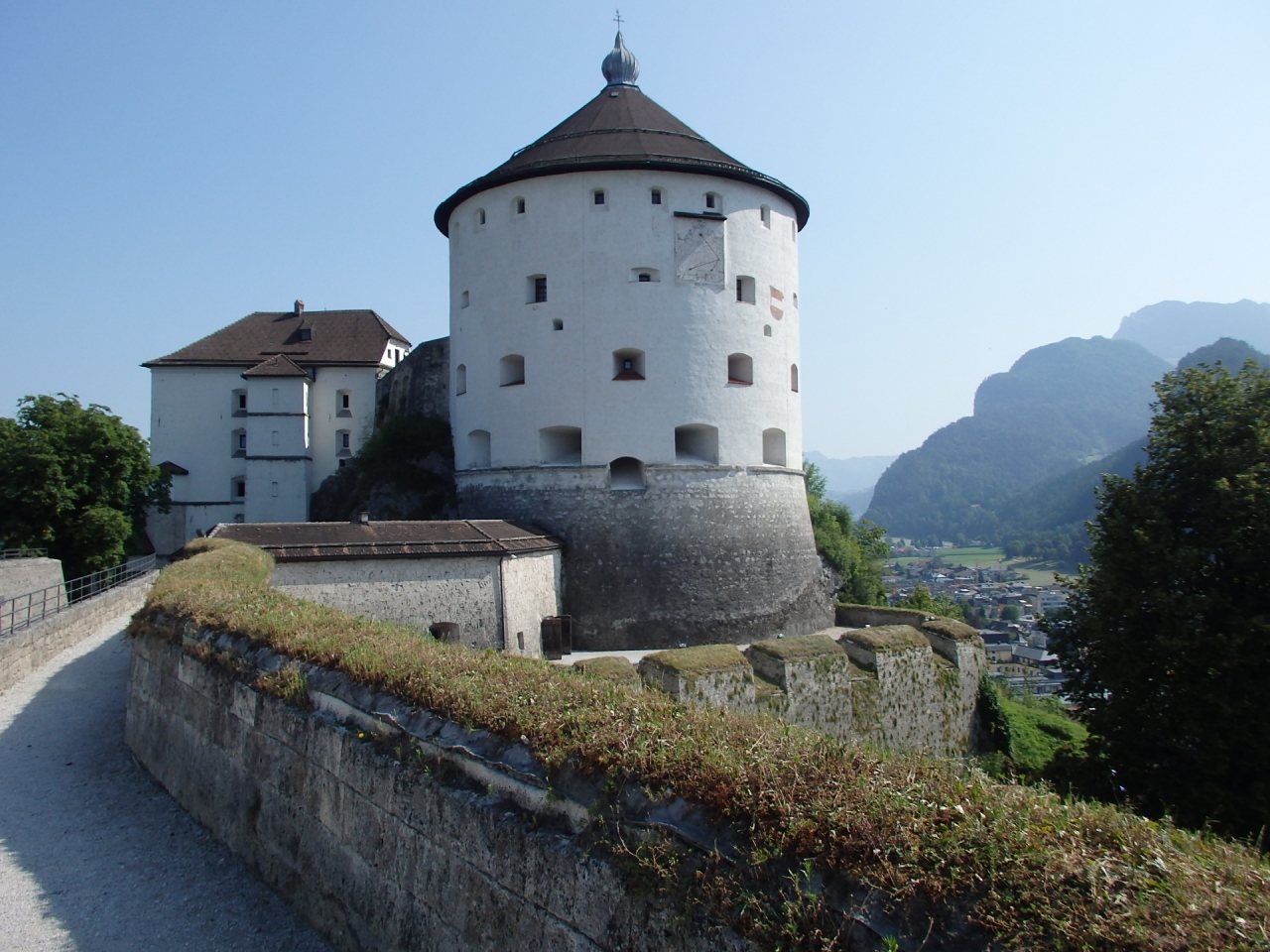 クーフシュタインの中心地マルクト広場(ンテラー・シュタットプラッツ)の向かいにある教会脇の坂道を上って行くと、門のアーチがあります。そこをくぐるとチケット売り場があって、チケットを購入したらケーブルカーで岩山のてっぺんにある城塞へ一気に上れます。乗り場横の小さな建物内には4307本のパイプを持つ巨大なパイプオルガンの展示も見られますが、このパイプ自体は頂上近くの展示室で見られます。