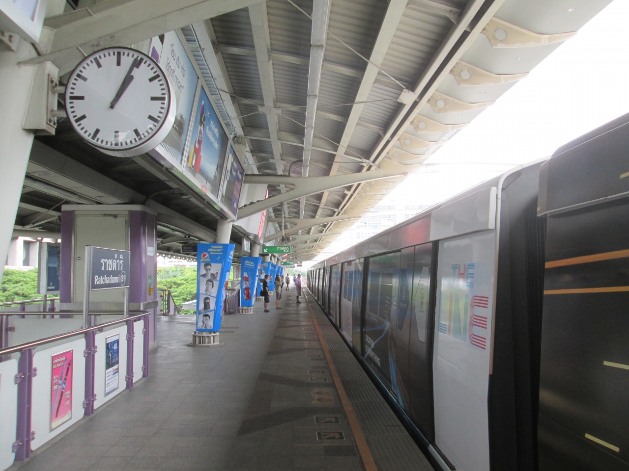 ラチャダムリ通りの上をBTSが走行しています。隣のサイアム駅から高架橋を大きくカーブしてラチャダムリ通りに入ってくるシーンが見れます。周囲には高級ホテルやコンドミニアムが立ち並び静かなエリアになっています。