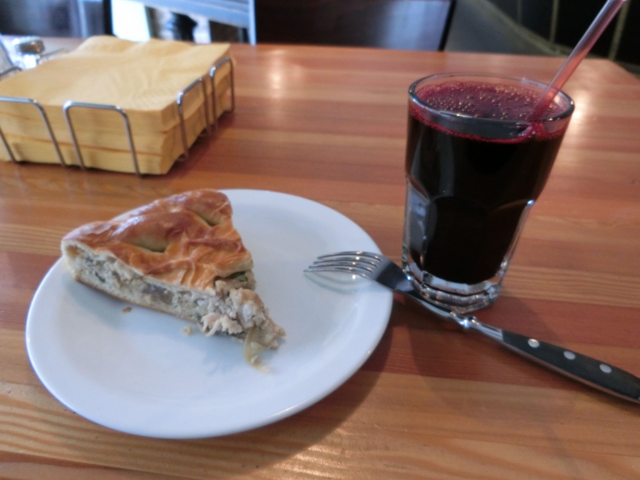 モルスは、こちらでは恐らくクランベリーから作ったように思われるが、濃い色でもすっきり飲みやすくパイともベストマッチだった。