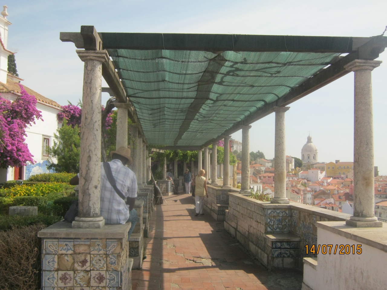 アルファマ地区の展望台です。ファド博物館の前の広場から狭い道とほぼ階段が続いています。その階段を上っていくとサン・ミゲル教会に行きそのさらに階段を上っていくと開けた場所にでます。教会の前庭が展望台です。そこからは太平洋が見渡せます。