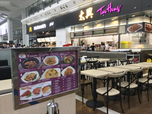 到着ロビーに出てまず気がつくのが、マクドナルドの隣にあった美心Food2がなくなって焼味(焼鴨、叉焼などローストミートのこと)チェーンの「太興」になったこと。キング・オブ・ロースト賞に輝いたこともある質で勝負のレストランですが、ファーストフード店ではないので他の焼味チェーンと比べると約2倍の価格なのが残念なところ。
