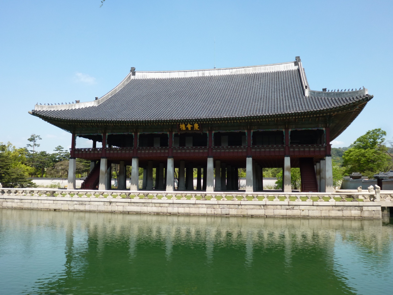 勤正殿の西側の池に浮かんでいるように建てられた、楼閣です。内部は特別観覧の時にしか見ることはできません。梅の時期や紅葉の時などは特に美しい光景のようです。近くに、衣装を借りられるところがあるので、宮中衣装で、建物をバックに写真を撮っている人も多かったです。