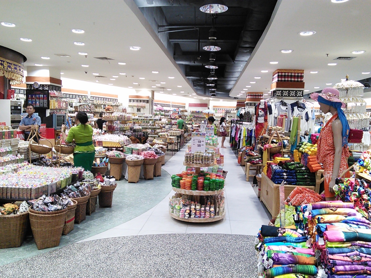 2,3Fはレディース、メンズのアパレル、サンダル、シューズ、化粧品など。4Fはキッズ関連、おもちゃ、スーツケースが売られています。我々旅行者が利用できそうなのは1F。お土産類がかなり充実しています。店内は明るく清潔、ほとんどの物に値段表示があるので面倒な交渉や駆け引きの必要はありません。ゆっくり落ち着いて買い物できます。