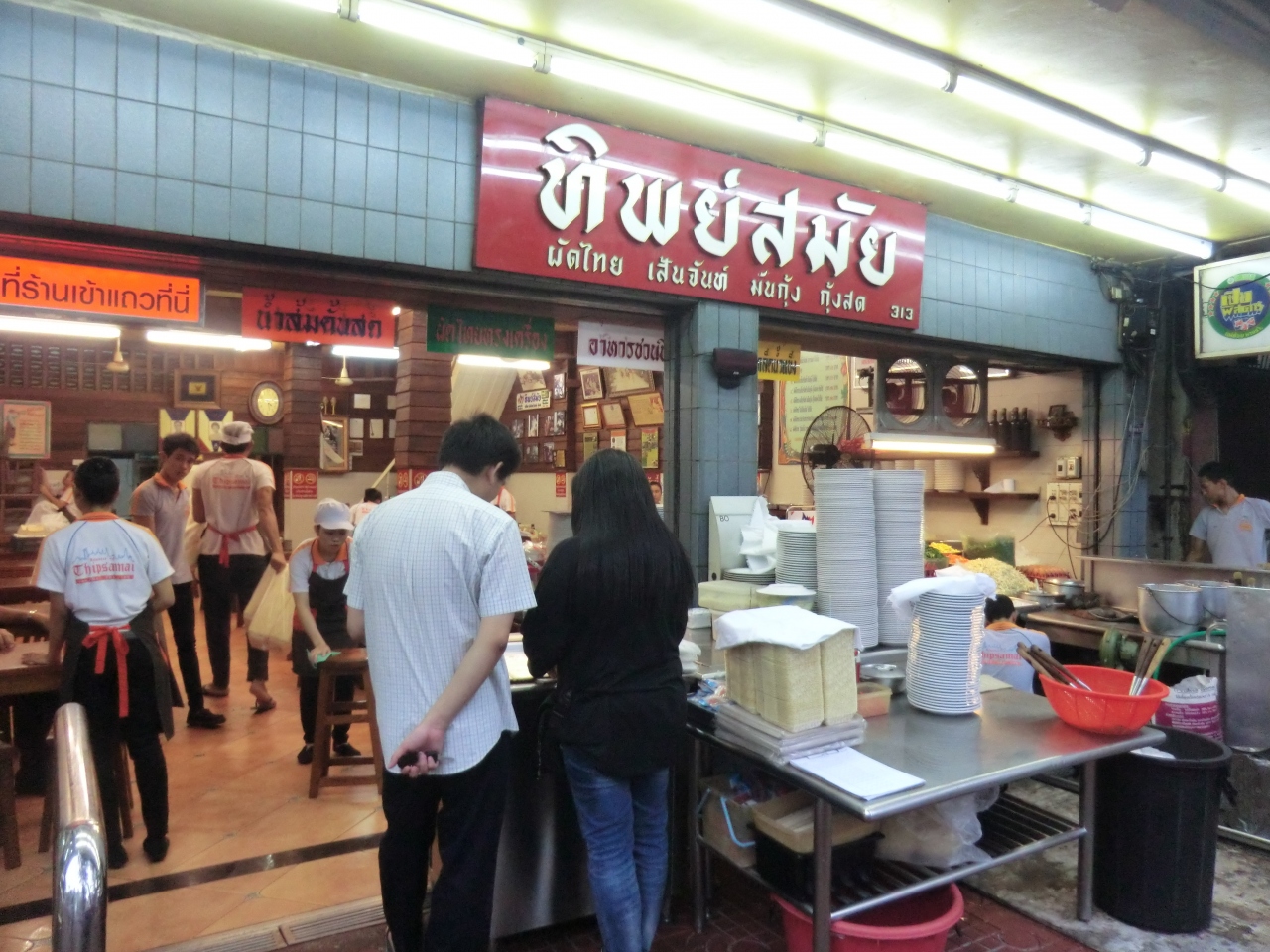 パッタイ(タイ風焼きそば)の専門店で、場所は王宮やカオサンロードのあるエリア。アクセスは不便で、バス利用で地図で探しながら行きました。パッタイ・ピセー(スペシャルなパッタイという意味)が人気商品です。焼きそばを卵で包むオムそばで、普通のパッタイよりも大きな海老が入っています。そしてこの店のもう一つの売りが、果汁100%のオレンジジュースです。パッタイとこのオレンジジュースの相性がなかなかいけます!店頭で手際よく調理している様子がこれまた職人芸という早業でした。店は大変込み合うので、開店と同時(夕方)に行くのがお勧めです。不便で苦労して(バス)行きましたが、味は大変おいしかったです。
