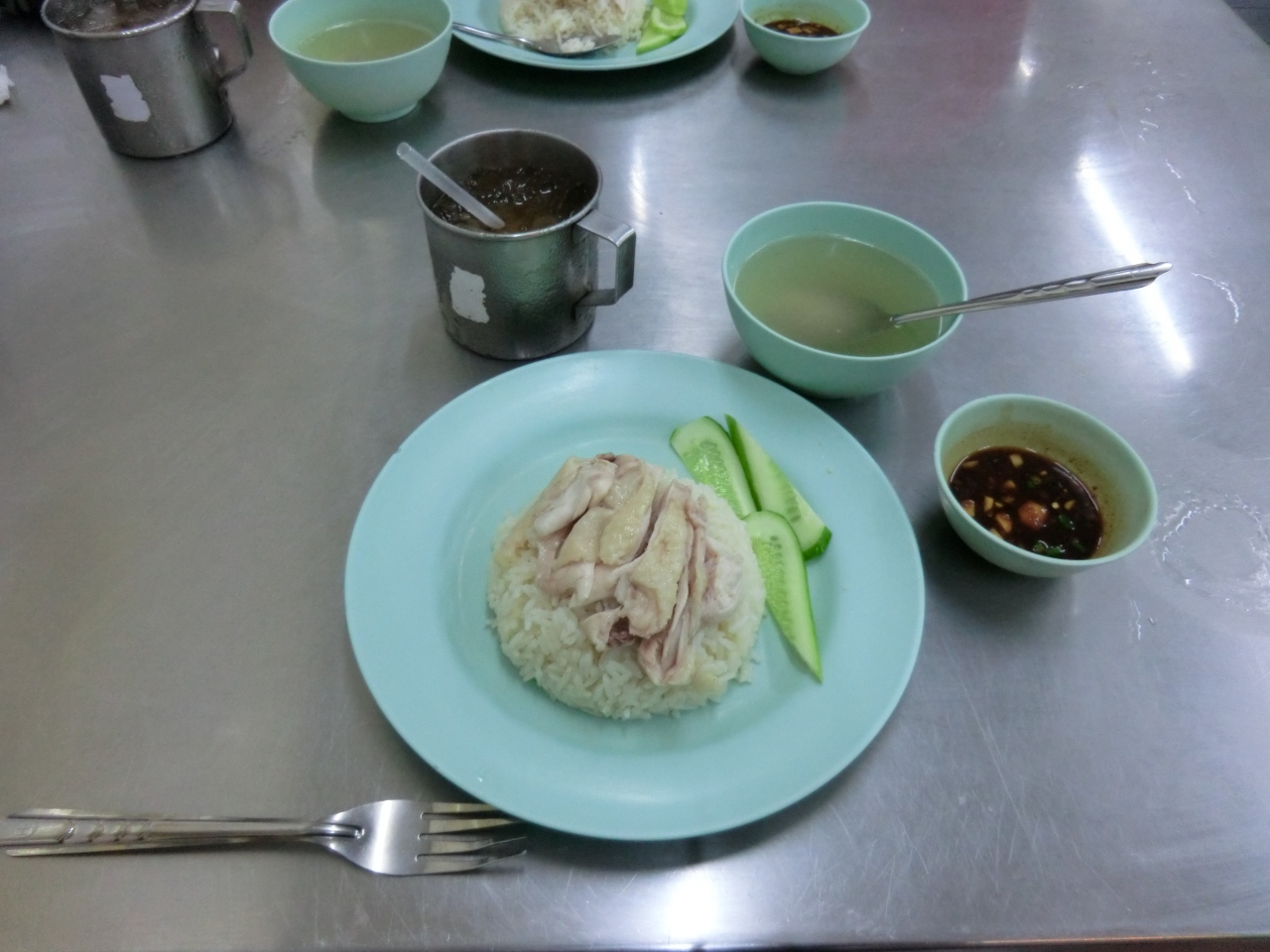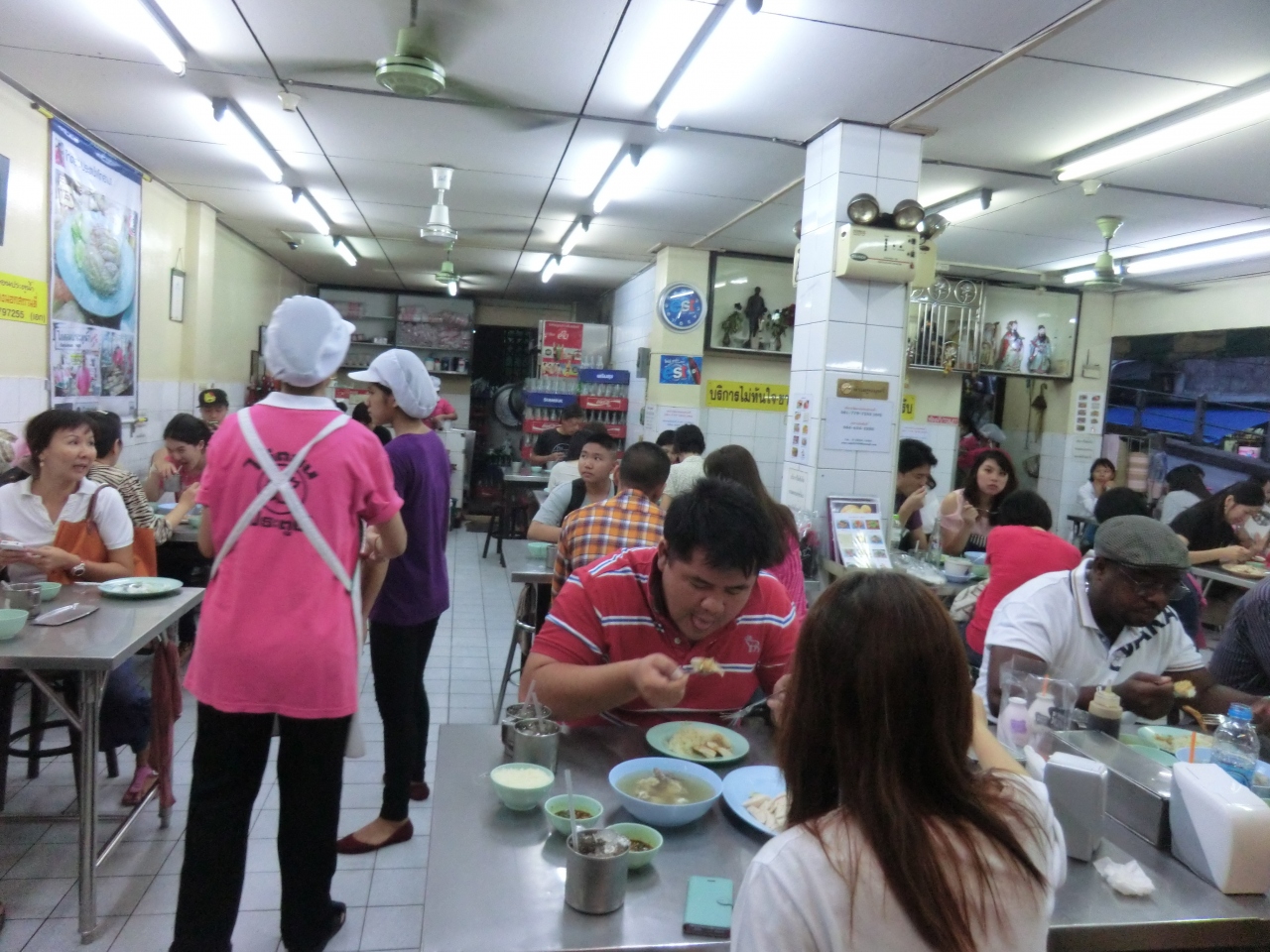 バンコク・プラトゥーナムのラチャダムリ・ロードとニューペブリロードの交差点近くにあるカオマンガイの有名店です。カオマンガイとはタイのチキンライスで、鶏がらスープで味付けしたあっさりした炊き込みごはんといったところでしょうか。茹でた鶏肉は柔らかくライスもしっかり鶏の味がきいています。唐辛子が入った辛味の効いたソース?をライスに掛けて食べるとナイスマッチです。値段は大変安く、おやつや夜食としても食べられます。伊勢丹のある繁華街を少し北に上がった交差点わきにある小さな食堂です。ピンクのTシャツを着たスタッフが目印です。バンコクに行ったら是非食してください!