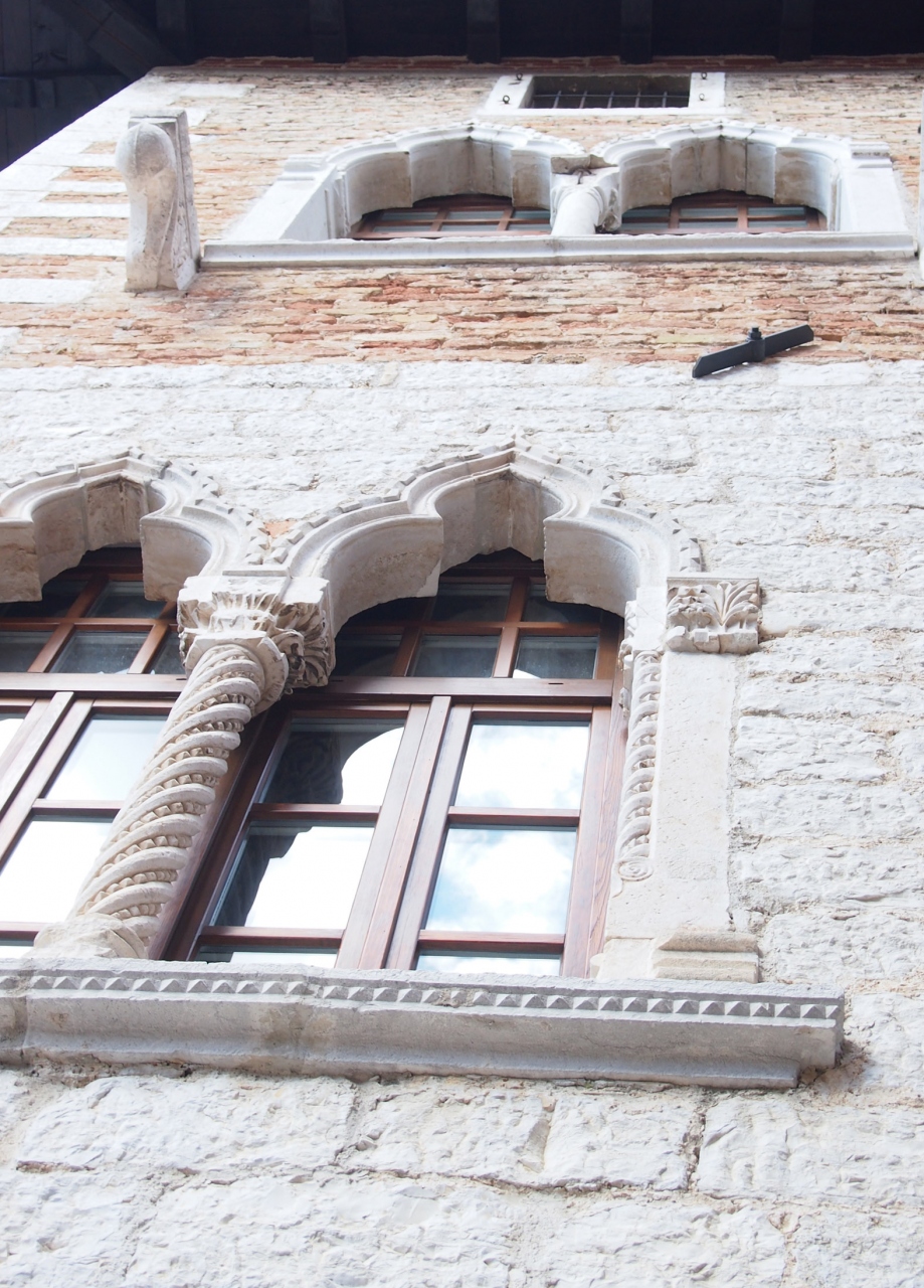 一階は石造りの壁、二階はレンガの壁のコントラストになっています。ポレチュの歴史的建物に見られるダブルアーチの窓は豪華さと優美さがあります。