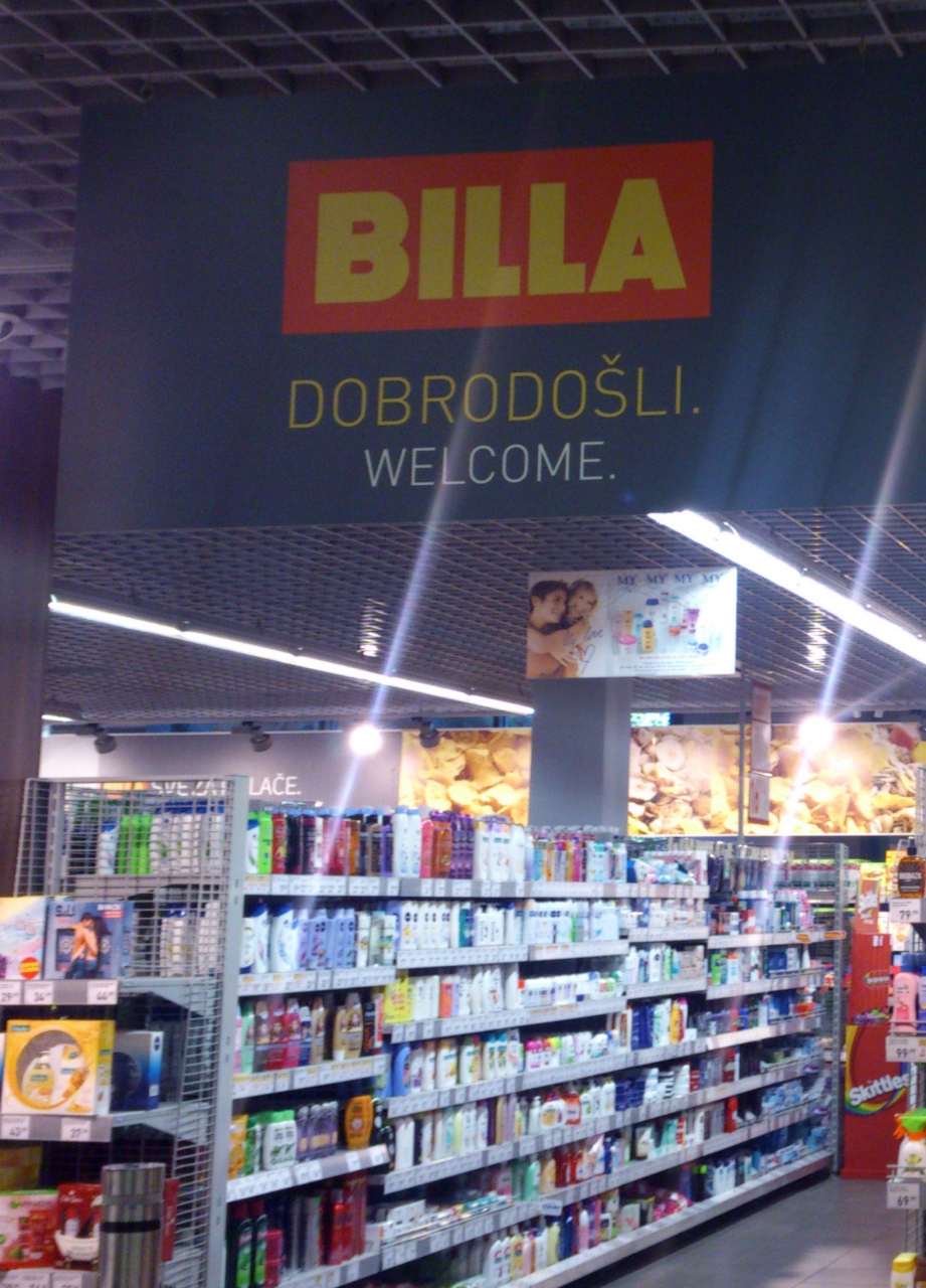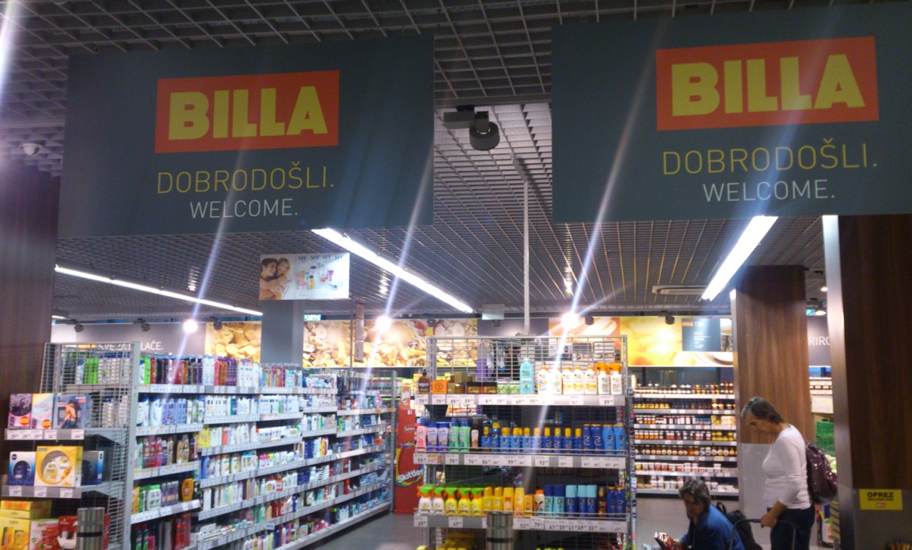 ポレチュ長距離バスターミナルに隣接するRIVA MALLに入っている大型スーパーBILLA。食品や日常品を調達するのに便利です。ザグレブにもありますがバラマキ土産だったらここで買っても構わないと思いますよ。