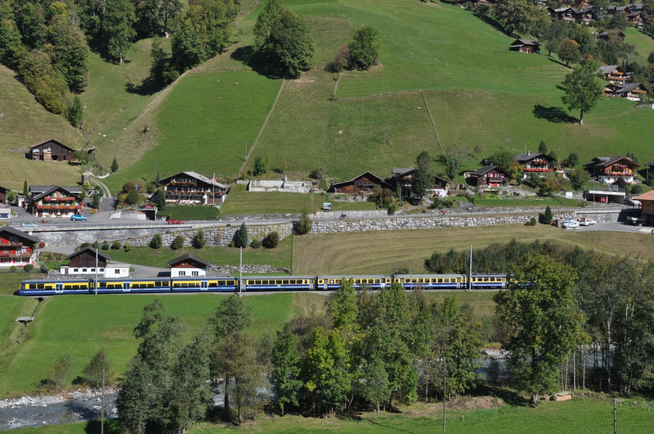グリンデルヴァルトからユングフラウヨッホまで行くときに利用しました。また、泊まったホテルの窓からもこの黄色と紺色の電車が見え、スイスに来ているんだなあと実感しました。登山電車でもあり、線路のレールの真ん中にはもう一本、ギザギザになったレールが敷かれています。坂道を上るためにです。興味深いですね。