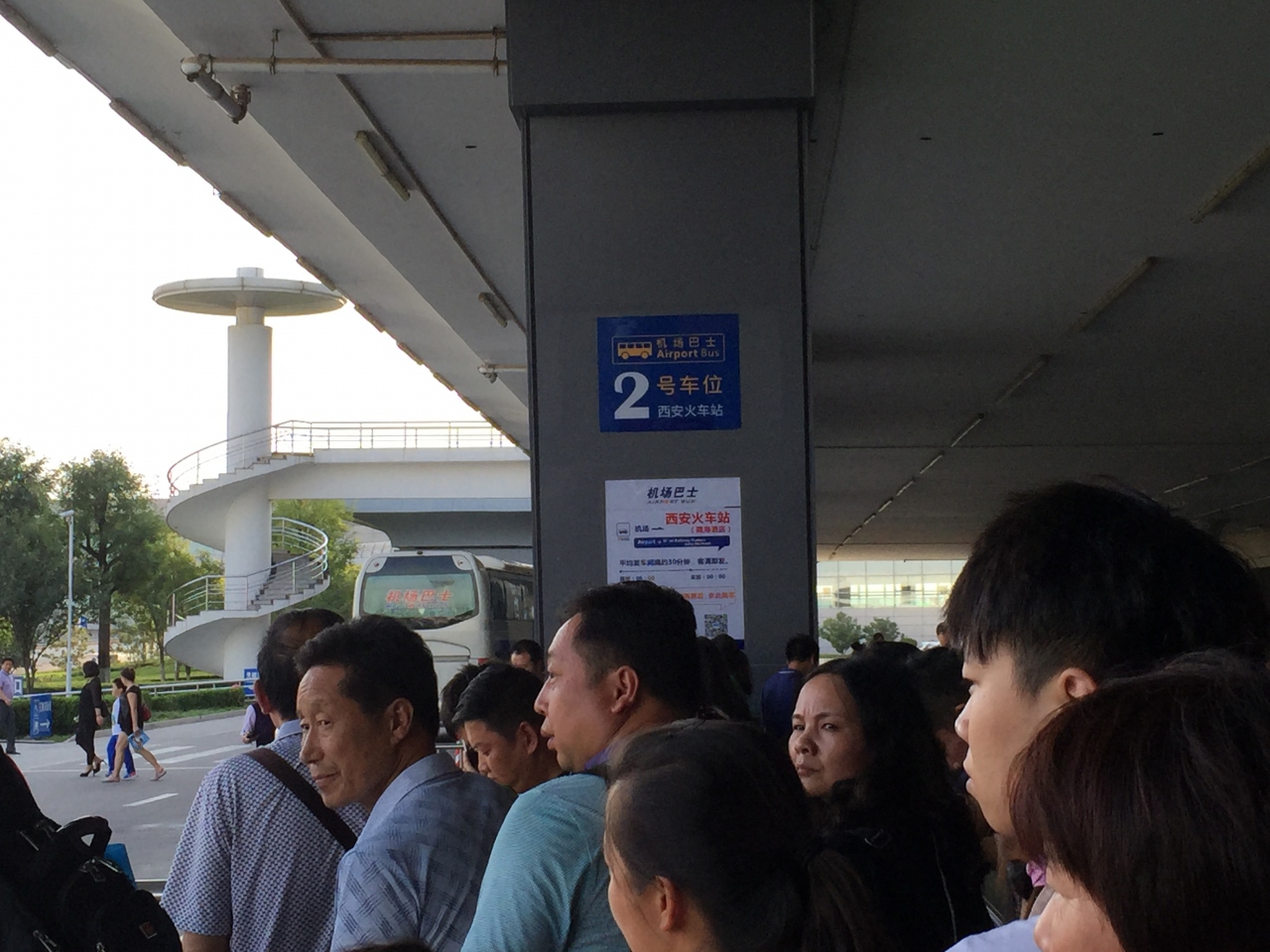 空港から2番のエアポートバスで西安駅行きに乗りました。実は,終点は、駅から結構南側にある陇海大酒店です。私が宿泊したヒルトンホテルには、駅より近いので、便利でした。結構混んでいますが、座席数しか客を乗せないので、早めに行くことが大切です。