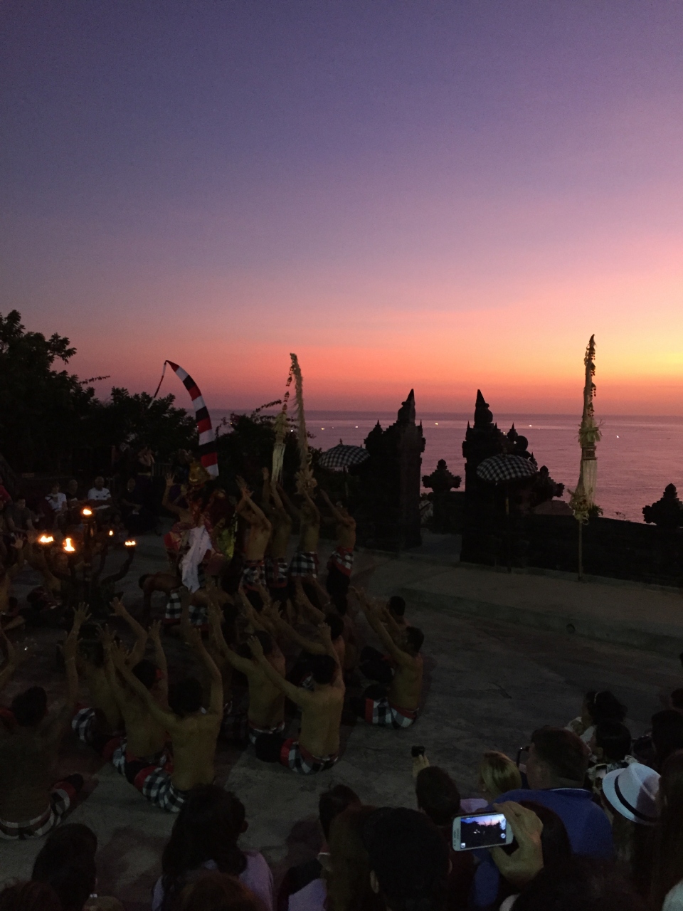 ここのケチャは、ロケーションが素晴らしいのと(雄大な海を背景にした野外劇場)、分かりやすくて面白い(伝統的というより観光客向けにショーアップされ、ファイヤーダンスなどもある)という意味でオススメです。混むので、できれば開始1時間前に着くのが理想だそうです。自分たちはギリギリに着きましたが、夕陽に浮かび上がるウルワツ寺院の美しいシルエットを背景に記念撮影をさっと済ませ、会場に入り、なんとか席を確保できました。途中で席を立って去っていく某国の人々が多くてビックリしました。