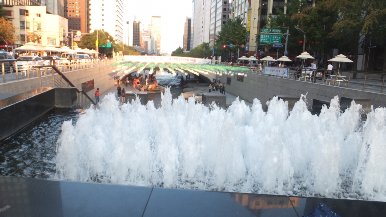 清渓川のスタート地点に当たる広場で、いつも多くの観光客がいます。今や綺麗な清流となった清渓川の川沿いをここから散歩するのも気持ちいいものです。多くのカップルや親子連れなどが歩いていて、市民の憩いの場となっていることに羨ましく感じます。東京にはこういうスポットないですので・・・。