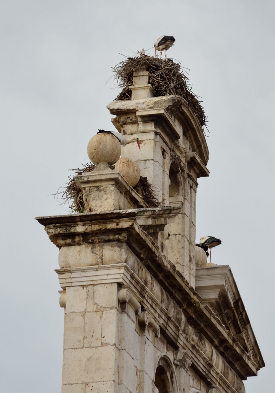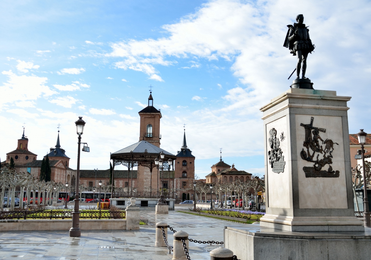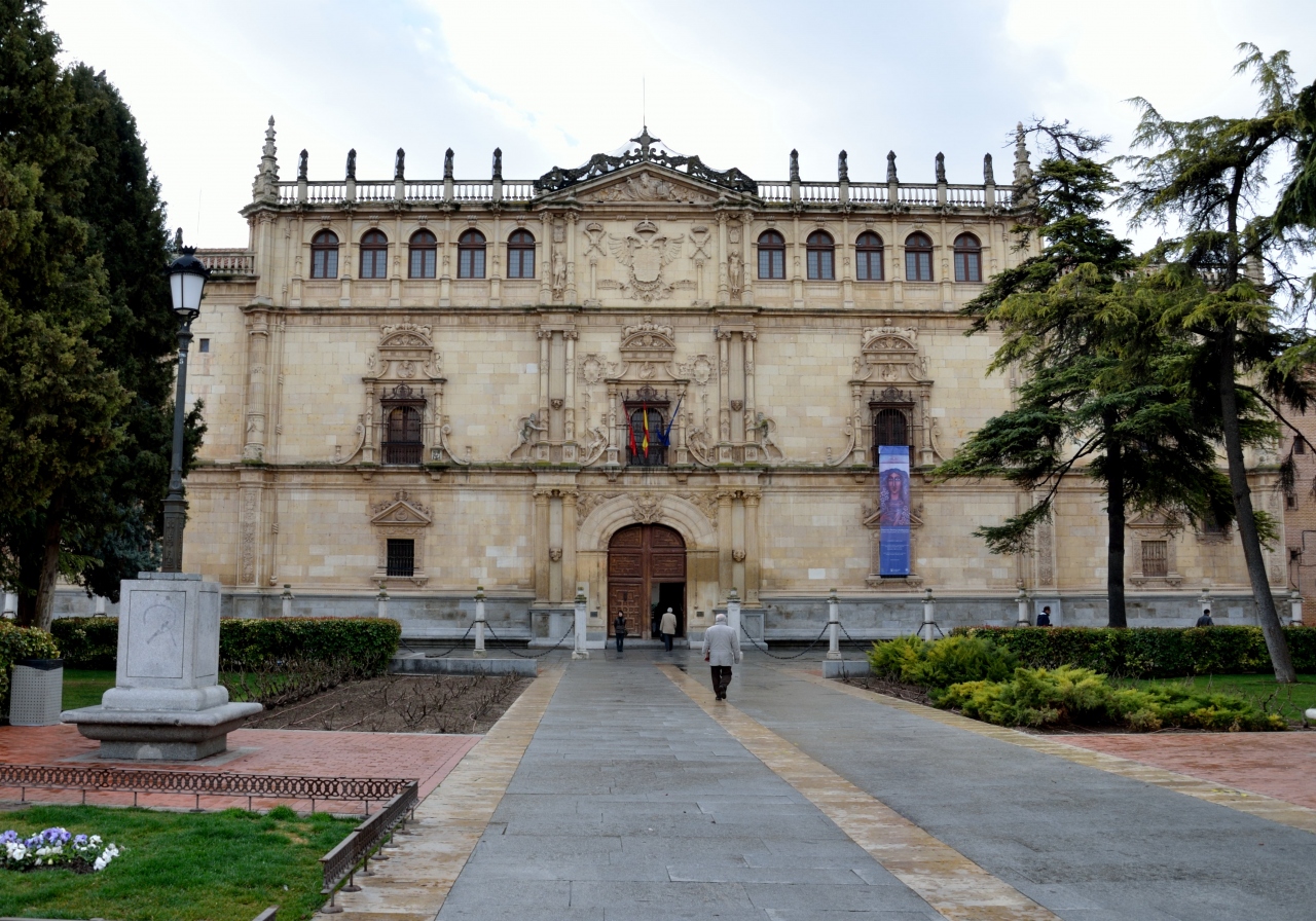 マドリードの空港から車で約40分、今回の旅の最初の訪問地はアルカラ・デ・エナーレスです。ここはサン・イルデフォンソ大学を中心とした歴史地区が世界遺産に登録されており、セルバンテスの生まれたところでもあります。車を駐めた広場を中心にぐるっとひと回りしましたが、きれいな町です。あちこちの塔の上にはコウノトリが巣をかけていました。先を急いでいたので1時間半くらいで町を出ました。