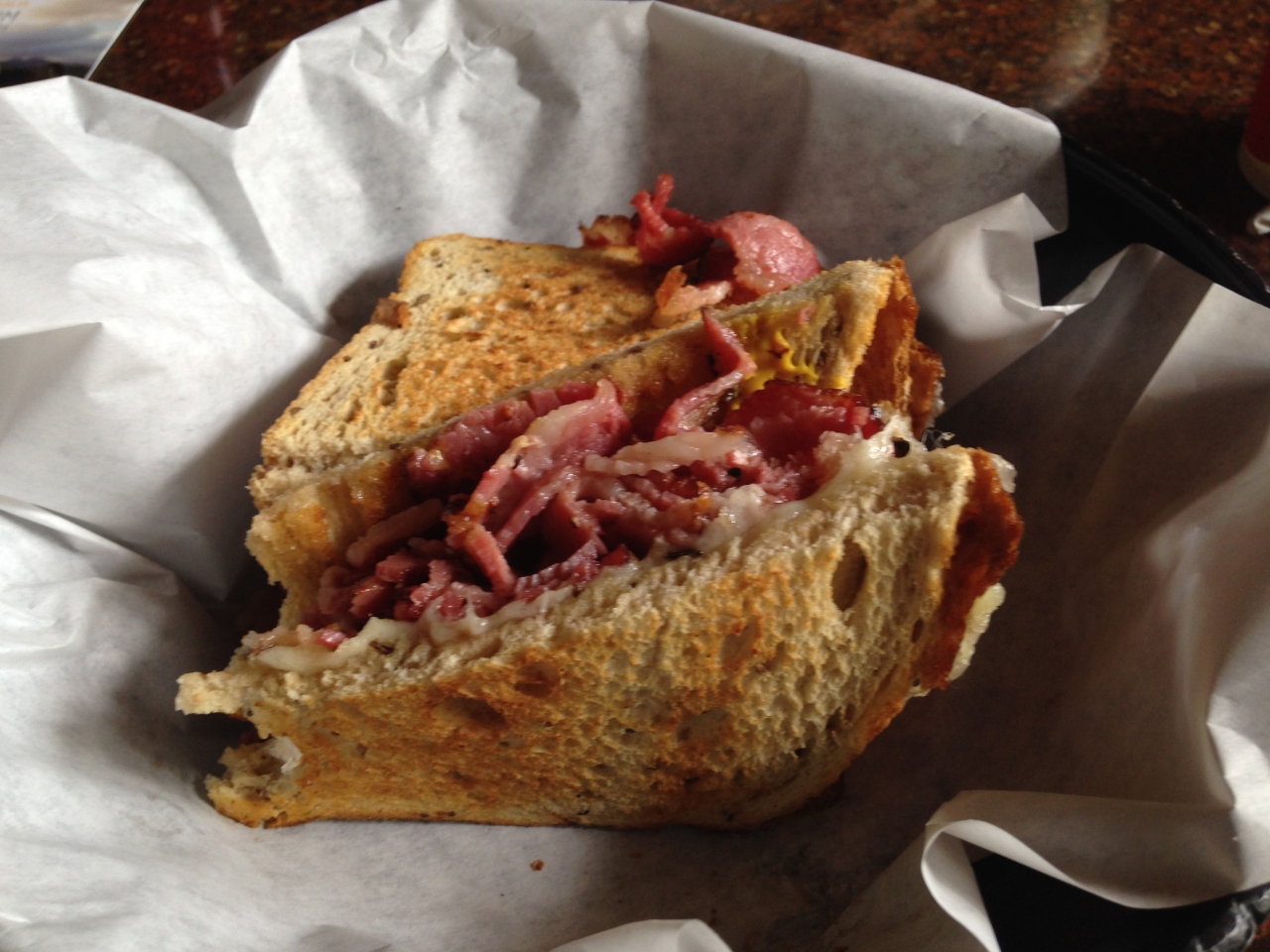 アラモアナからザバスで約45分のカイルアタウン。パンケーキには少々飽きたので、以前から気になっていたこのカフェに行ってみました。席数はそれほどありませんが、可愛くて落ち着けるカフェで、店員さんも明るく親切でした。日本語メニューもあり、日本人は私たち以外に一組いました。パストラミサンドイッチとドリンクで10ドルくらいでした。特に絶対リピートしたいというほどではありませんが、普通においしかった。ボリュームはそれほど多くはありませんので、日本人には適量だと思います。