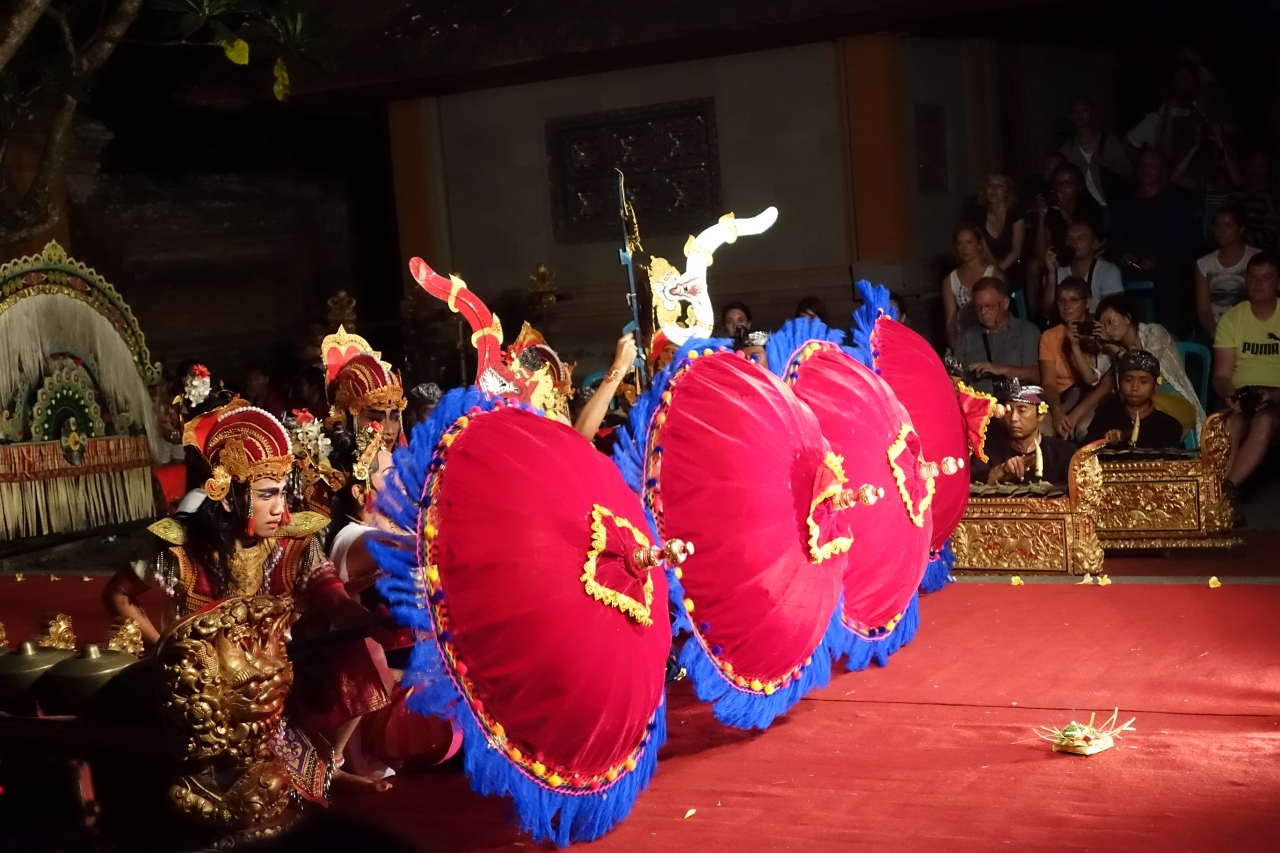 王宮だけあって舞台は重厚な感じです。伝統的な楽器の演奏から始り、ソロダンスとグループダンス(このときトランス状態で踊る)などと続き、最後は舞踏劇でと時間以上やっていて充実した内容だった。
