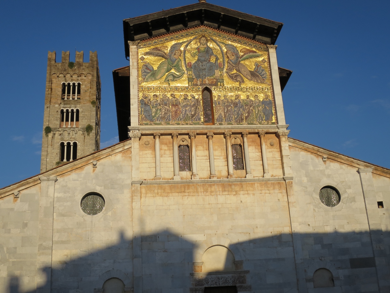 フィッルンゴ通りを歩いていると開けた広場があり、その向こうにサン・フレディアーノ教会がありました。サン・フレディアーノはルッカ司教でルッカの守護聖人です。教会は1112年に拡大建築され、13Cにはファサード中央のトップにモザイクがはめ込まれほぼ現在の形になりました。