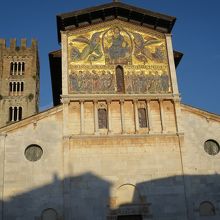 モザイク部分はキリストの下には使徒と共に聖母があったそうですが、後代に窓が開けられ、聖母部分がカットされたそうです。ファサードトップにモザイクを置くスタイルはトスカーナでは珍しいと思います。夕方よりも朝の方が、太陽の光でキラキラ輝きます。