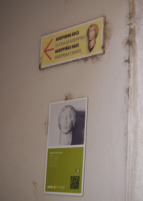 アグリッピナの家は、古代ローマ時代からあるフォーラム、フォロ広場の近く、Sergia 通り沿いから入る小さな遺跡です。今は建物に囲まれた古い土台だけの遺跡です。ここでは様々な出土品があったそうですがその中にネロ皇帝の母、アグリッピナの像があったそうです。